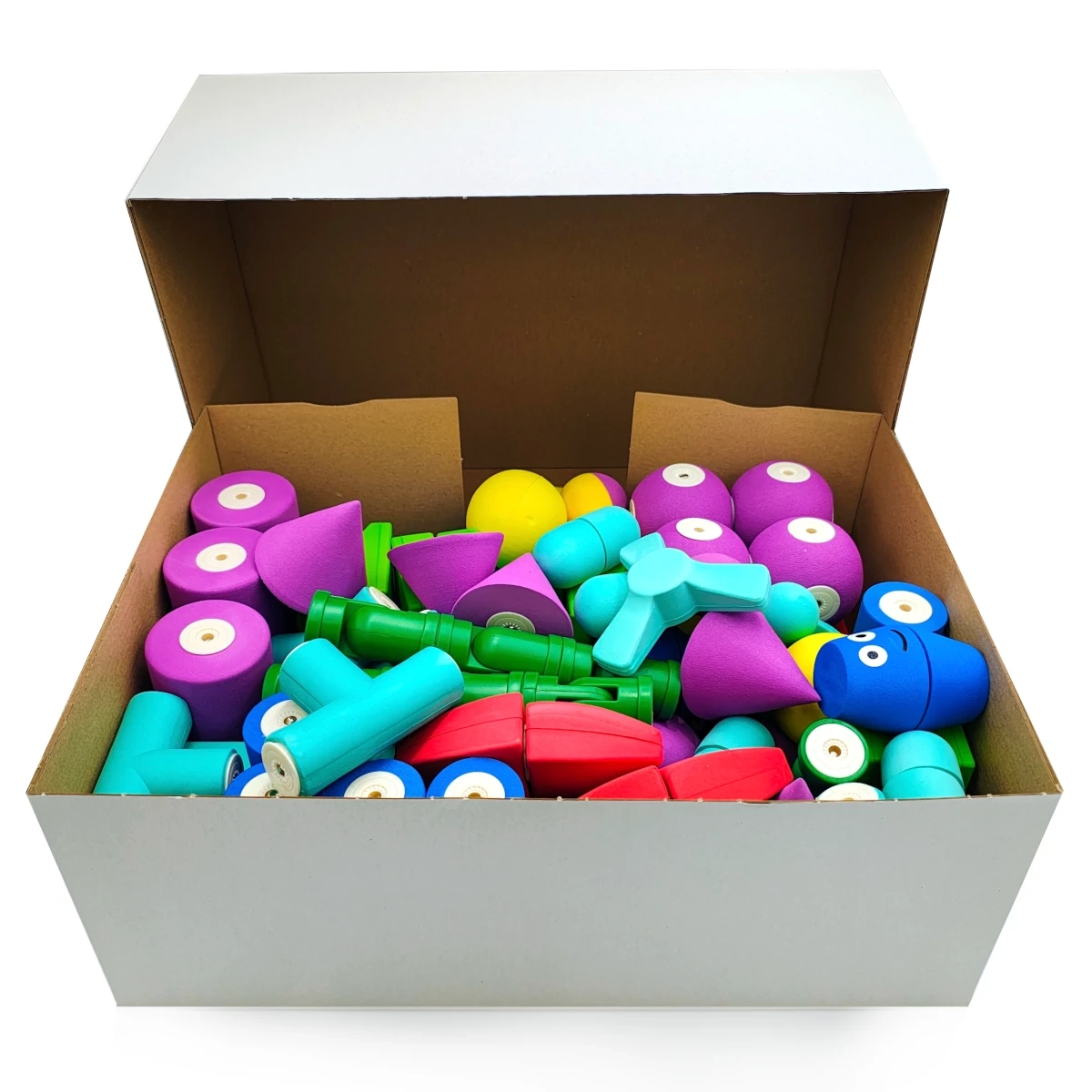 Set mare cu forme diverse – roți, pătrate, triunghiuri, distanțiere și conectori flexibili din plastic – oferă copiilor libertatea de a crea modele după imaginație sau după șabloane.