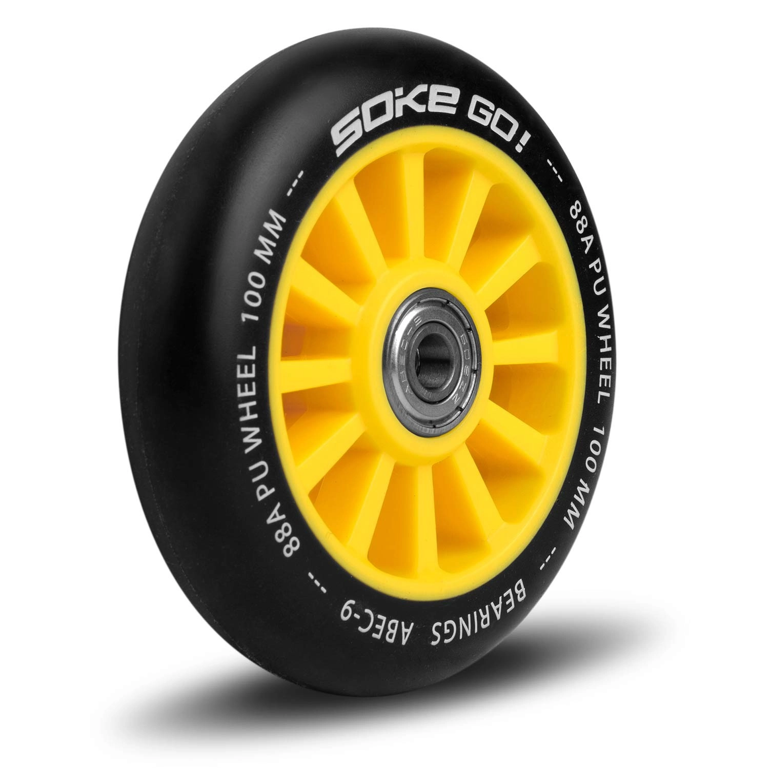 Roțile galbene SOKE 100 mm aduc o combinație de viteză, rezistență și grip sigur. Poliuretanul cu duritate 88A este perfect pentru suprafețe dure precum asfaltul, în timp ce rulmenții ABEC-9 asigură porniri line și rapide.