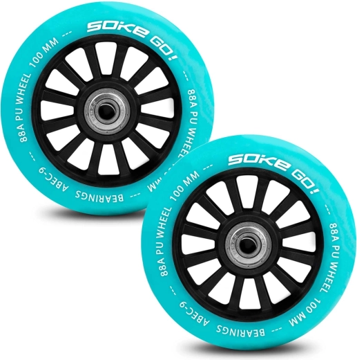 Roțile SOKE de înaltă calitate, în culoare turcoaz, oferă performanță fiabilă pentru mersul zilnic și antrenarea trick‑urilor. Amestecul de poliuretan 88A echilibrează viteza și controlul, în timp ce rulmenții ABEC‑9 asigură porniri line și rezistență minimă la rulare.
