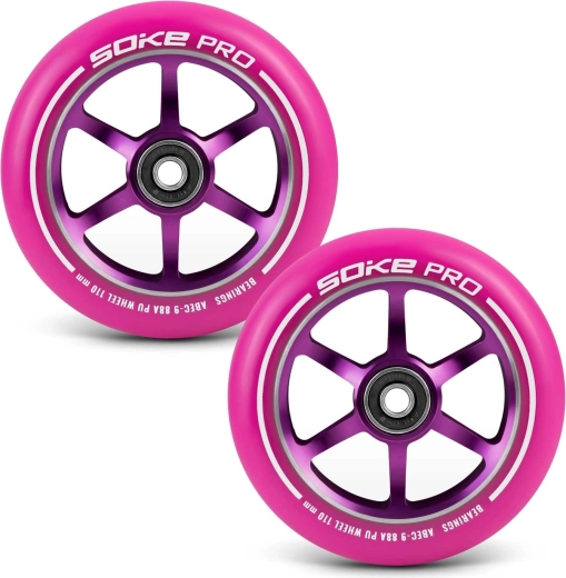 Rulmenții integrați ABEC-9 asigură o funcționare cursivă cu rezistență minimă. Setul include 2 bucăți de roți, compatibile cu ax de 8 mm. Finisajul roz stilat oferă trotinetei tale un aspect remarcabil și performanță pe care te poți baza.