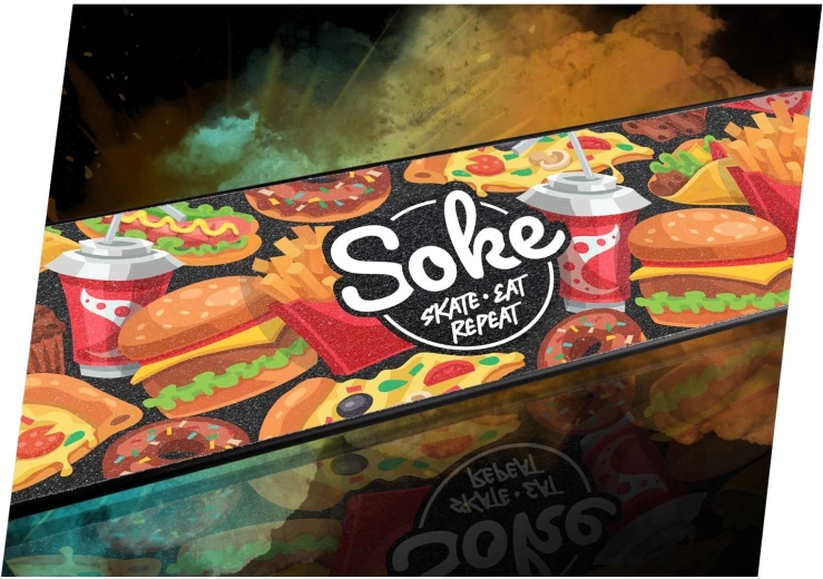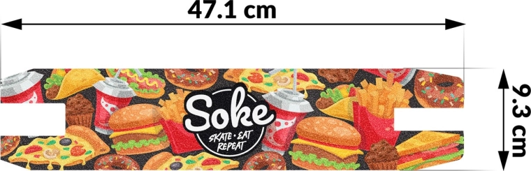 Îmbunătățește controlul asupra trotinetei tale cu grip tape-ul SOKE Go! – Fast Food. Granulația mai aspră oferă un contact ferm și stabil între încălțăminte și deck, astfel încât te poți concentra pe învățarea trick-urilor noi și a combinațiilor avansate. Imprimeul stilat oferă deck-ului tău un aspect original și te va evidenția atât în parc, cât și pe stradă.