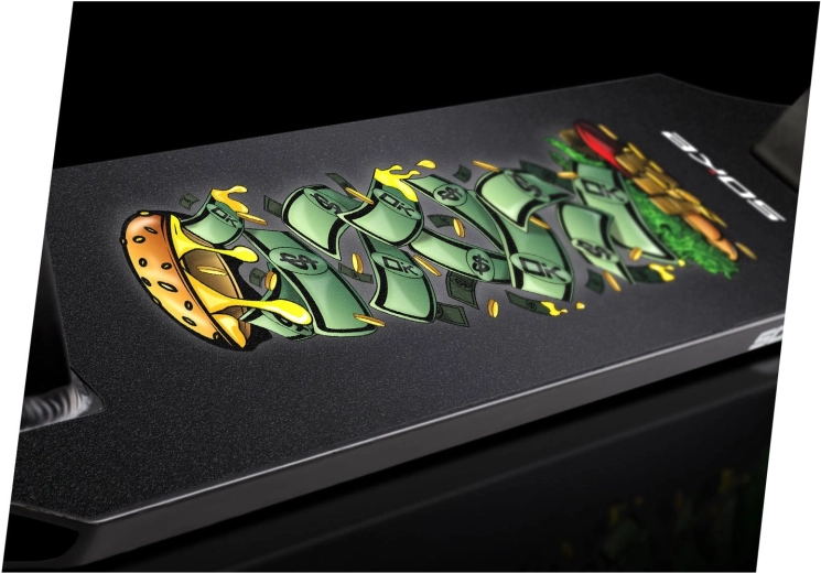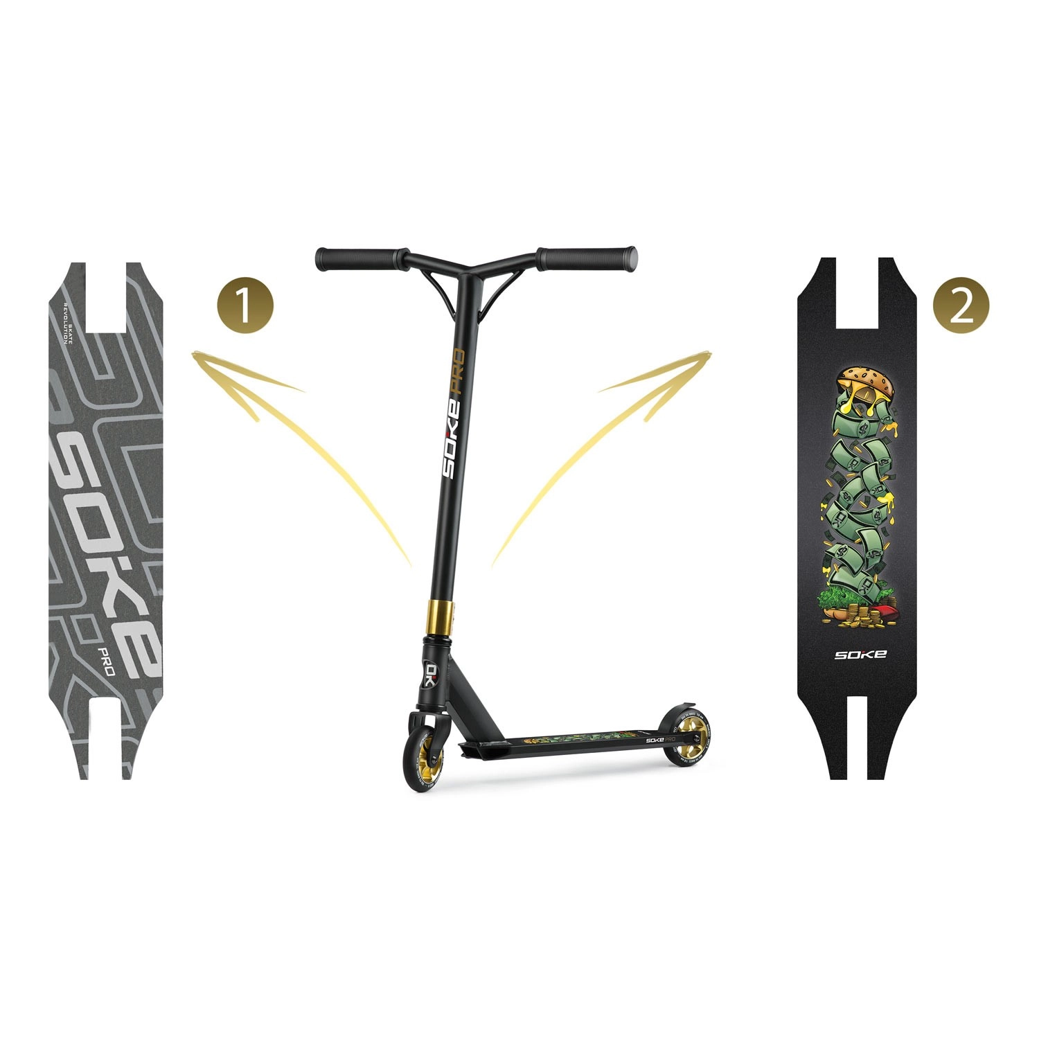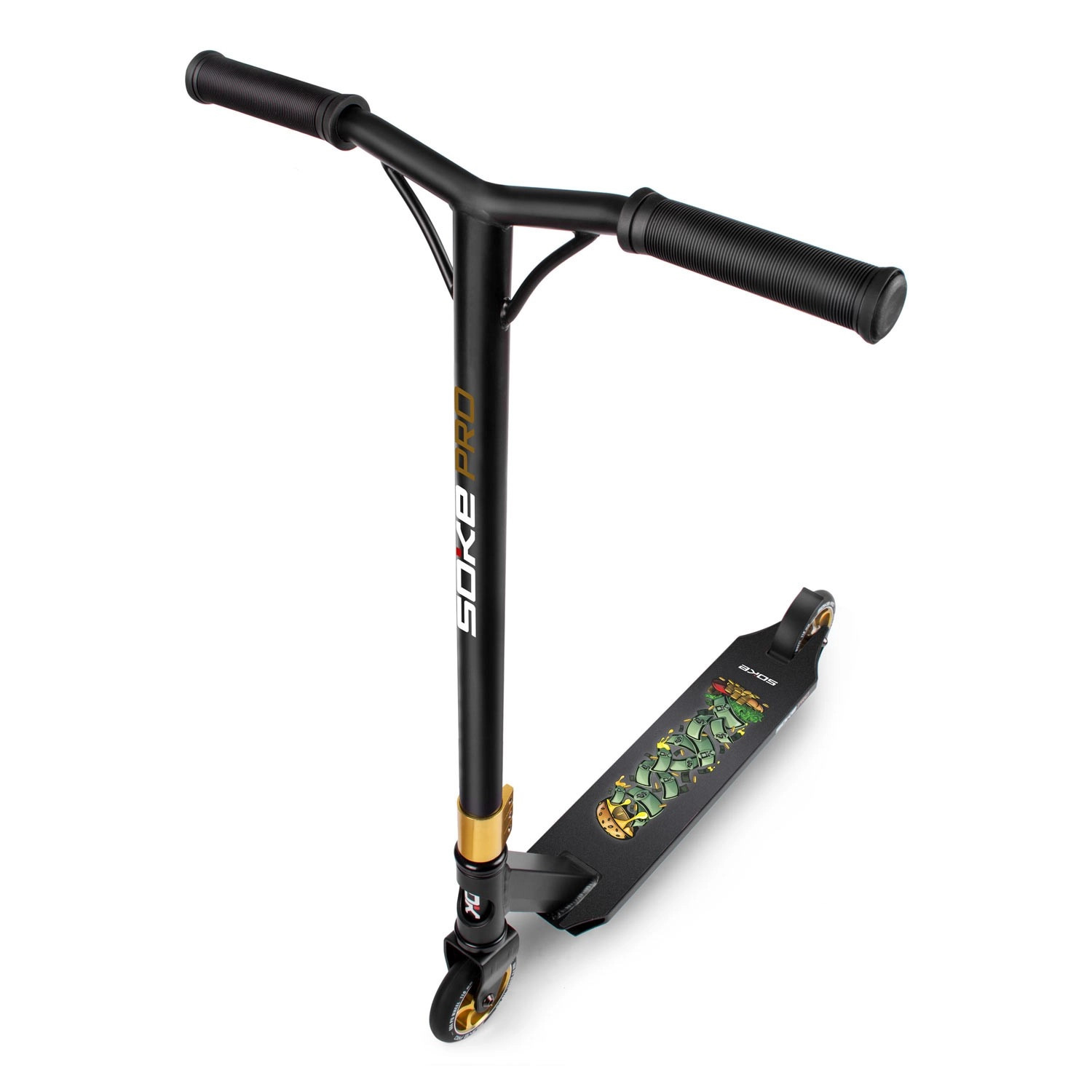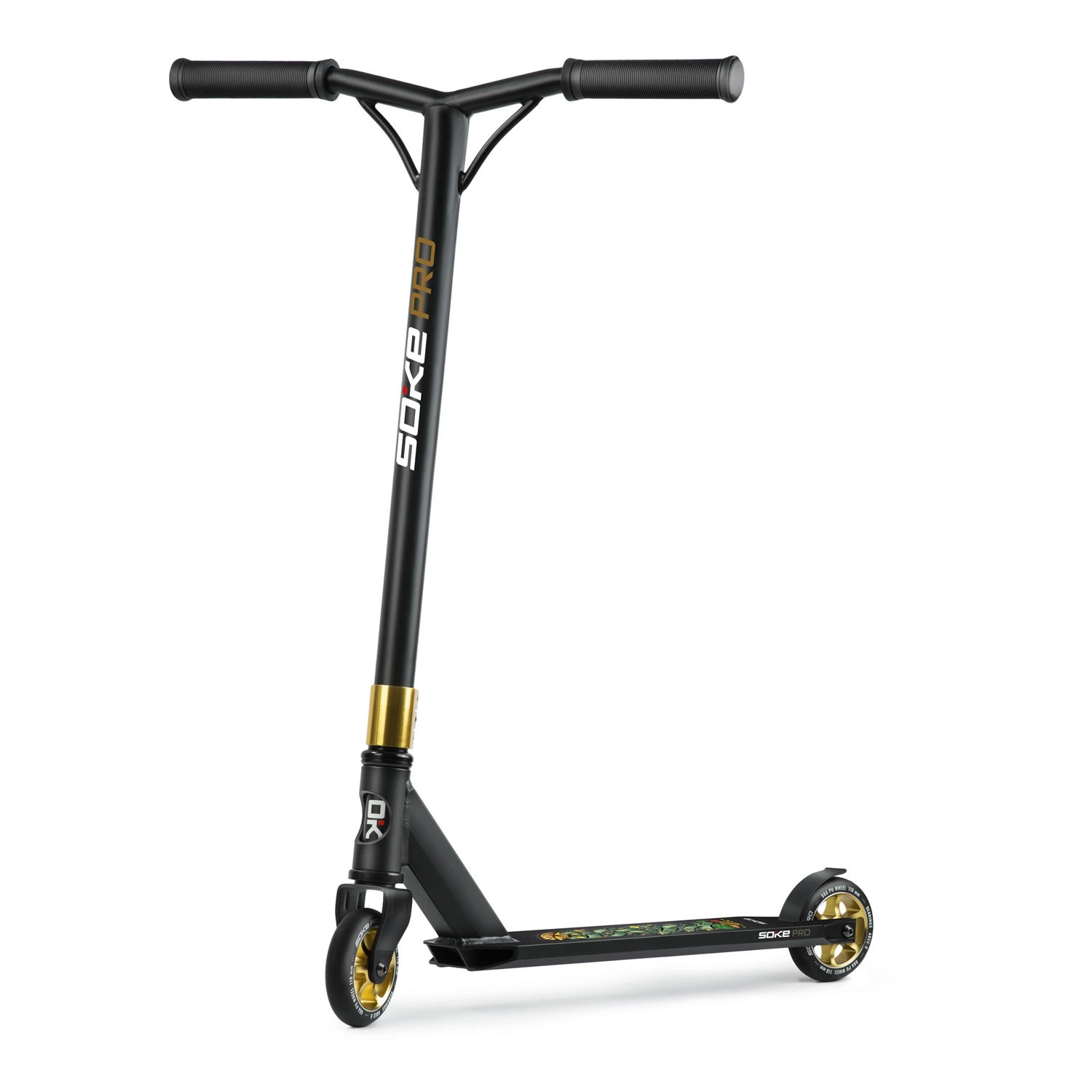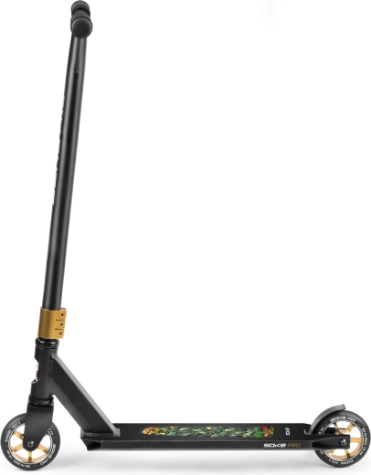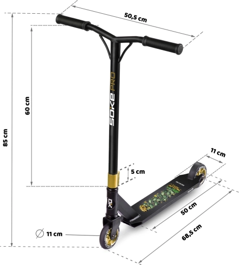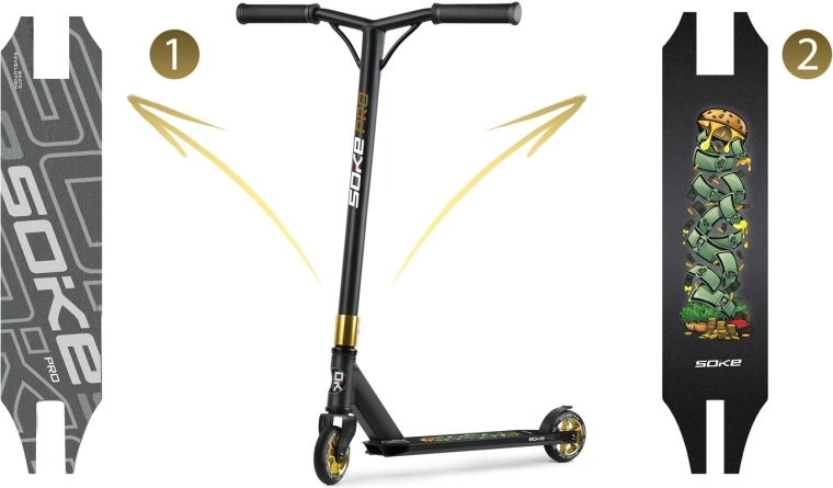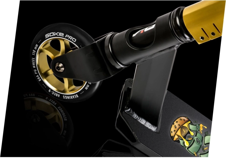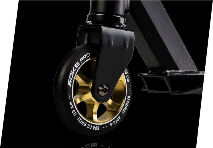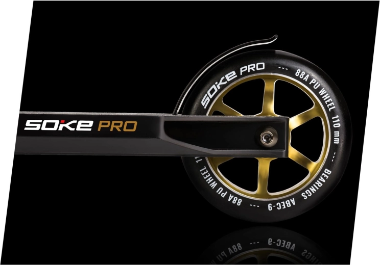 Trotineta freestyle Soke Pro Gold, ușoară și rezistentă, pentru skatepark și street, oferă rulmenți rapizi ABEC‑9, roți de 110 mm cu miez din aluminiu, frână FLEX FENDER și gripuri TPR late pentru o prindere sigură. Datorită compresiei HIC și clemei triple din aluminiu, este pregătită pentru trick‑uri, whip‑uri și progres zilnic. Include și griptape de rezervă și brățară branduită SOKE.