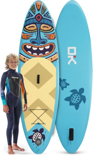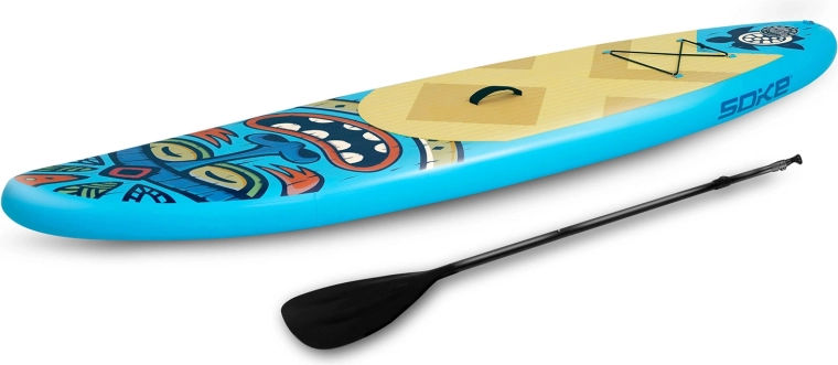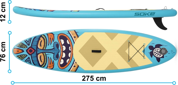 Descoperiți paddleboardul gonflabil Soke, ușor și stabil, pentru copii, adolescenți și adulți mai ușori. Setul complet include tot ce aveți nevoie: vâslă reglabilă, pompă cu dublă acțiune cu manometru, lesă de siguranță, aripă (fin) detașabilă, scaun cu spătar, kit de reparații și rucsac rezistent. Covorașul EVA antiderapant, construcția drop-stitch și sistemul bungee frontal pentru transportul comod al lucrurilor garantează distracție și siguranță pe apă.