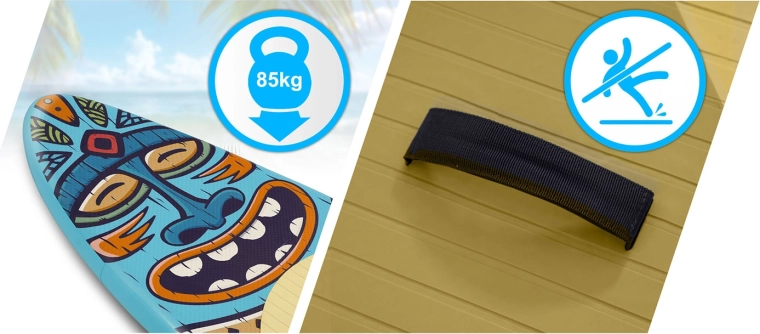 SUP-ul gonflabil Soke este alegerea ideală pentru începători și tineri rideri până la 85 kg, care caută stabilitate, manevrabilitate ușoară și portabilitate maximă. Placa de 275 × 76 × 12 cm, cu volum de 180 l, oferă pas sigur datorită spumei EVA antiderapante și transport confortabil prin mânerul central. Elasticul bungee frontal fixează geaca, sticla și mărunțișurile, ca să aveți totul la îndemână.