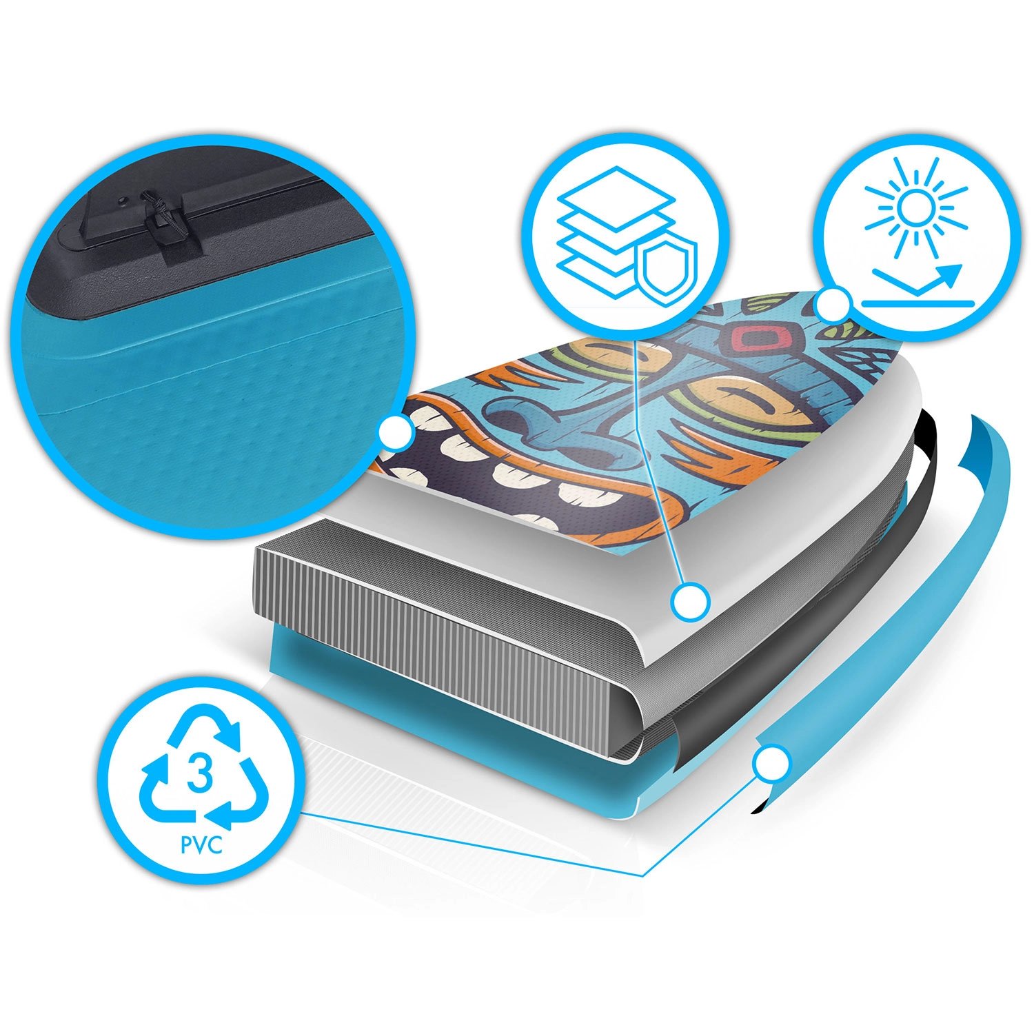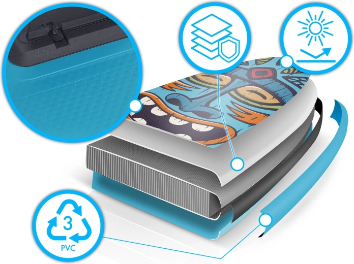 PVC multistrat cu tehnologie drop-stitch light asigură greutate redusă, rigiditate ridicată și durabilitate îndelungată, chiar și la utilizare frecventă în soare.