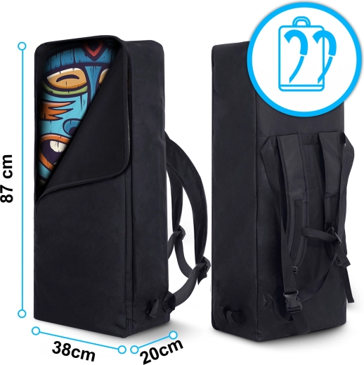 - Echipare completă în rucsac – placă, vâslă, pompă, lesă, aripă mare detașabilă, scaun, kit de reparații și rucsac de transport rezistent.