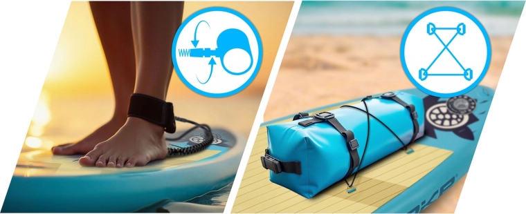 - Placă, pompă, vâslă, lesă, fin detașabil, scaun, rucsac, kit de reparații (petice PVC, adeziv, cheie de ventil, carcasă)