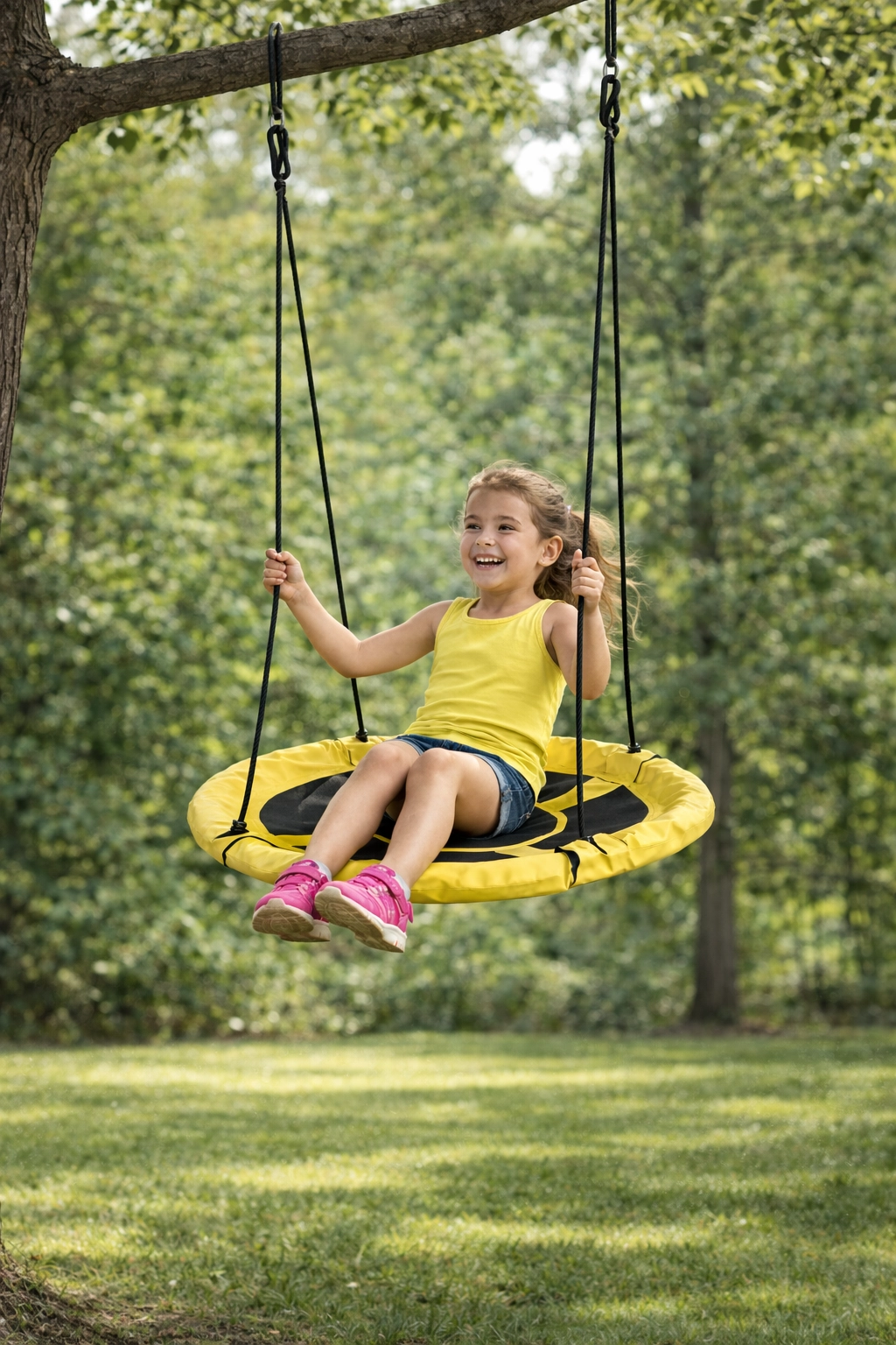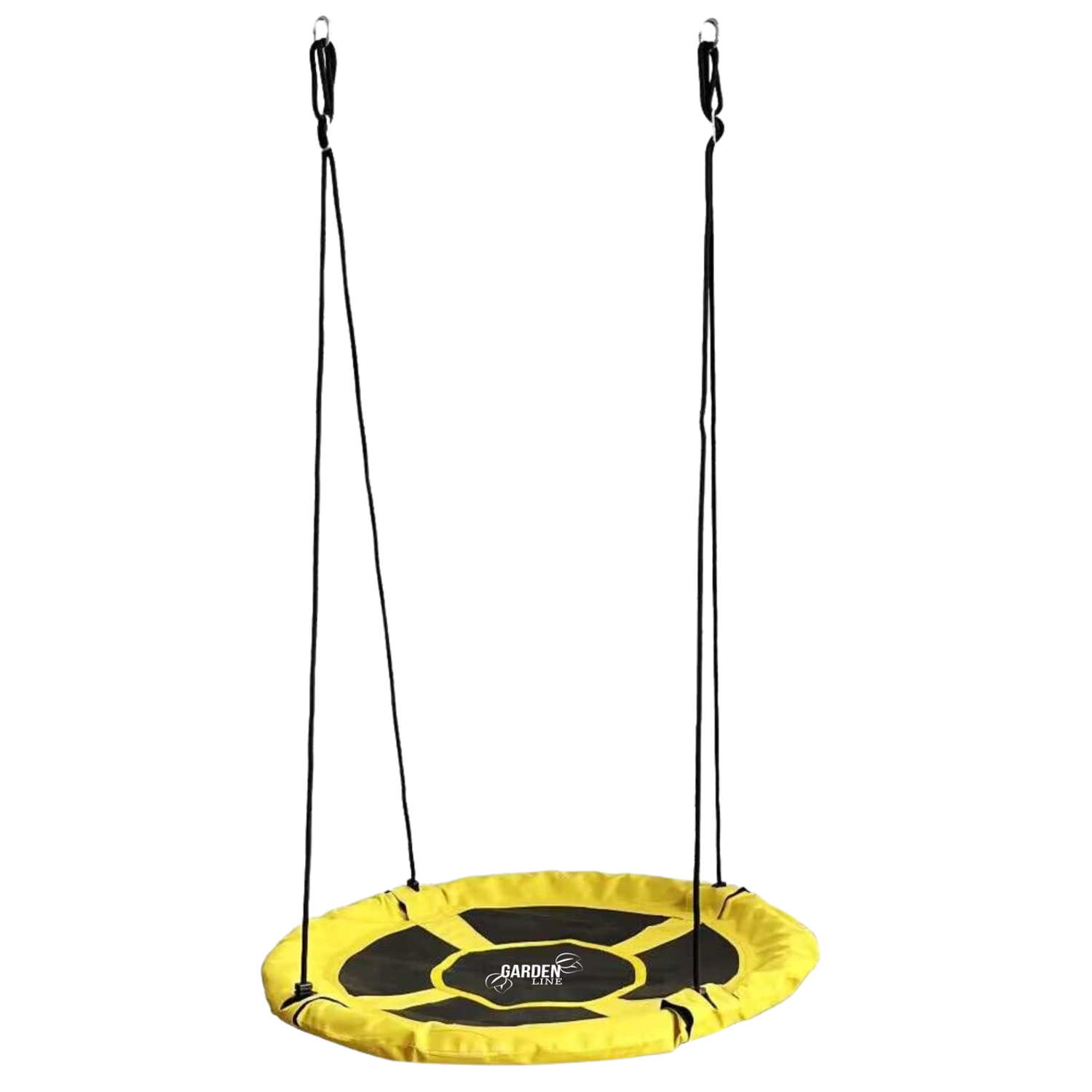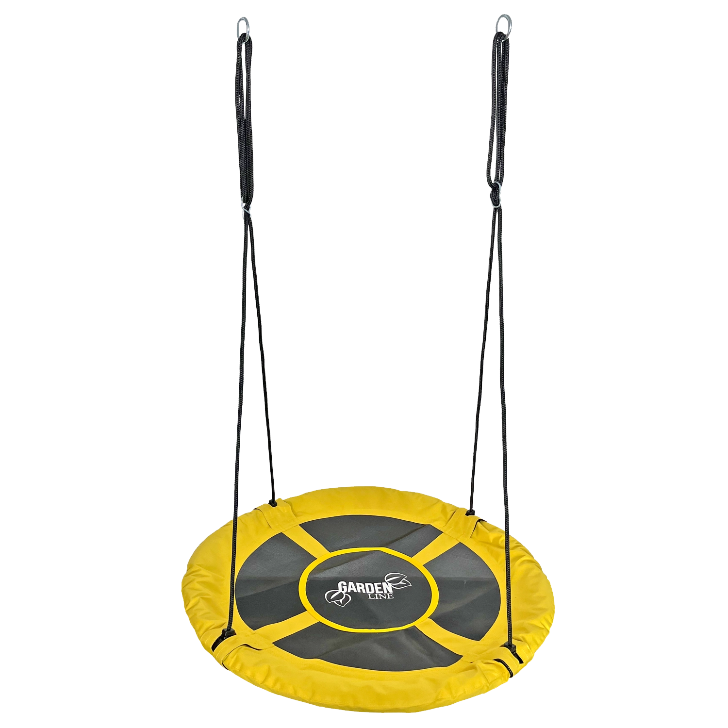 Leagănul cuib galben luminează instant orice curte sau grădină. Șezutul lat și confortabil, cu suprafață rezistentă și margine moale, este suspendat stabil în patru corzi, astfel încât copiii se pot legăna în siguranță așezați sau întinși. Diametrul de 100 cm oferă spațiu suficient pentru unul sau mai mulți copii.