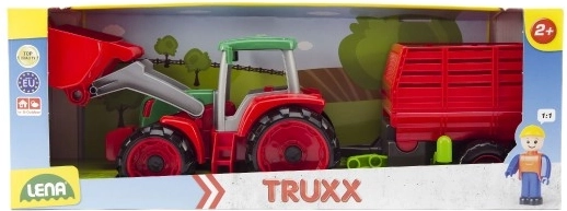 Vă prezentăm Lena Truxx tractor cu remorcă, jucărie ideală pentru micii fermieri. Acest tractor din plastic se remarcă prin designul său robust în culori roșu și verde, completat de o cupă funcțională și o remorcă detașabilă. În cabina tractorului este plasată o mică figurină șofer, care adaugă realism jocului.