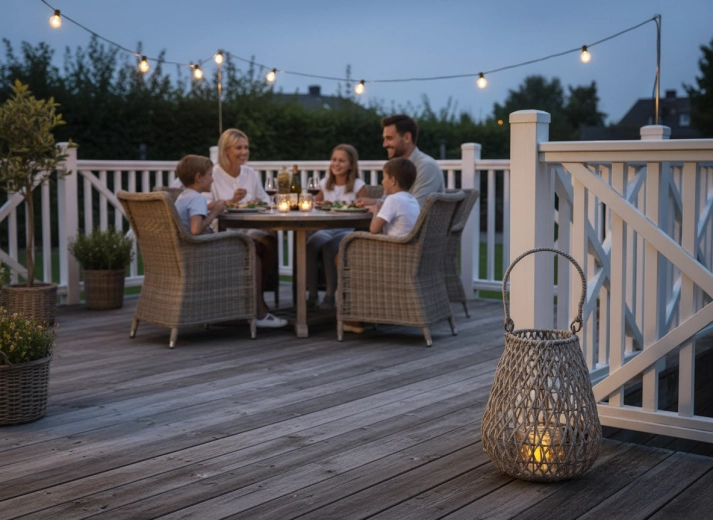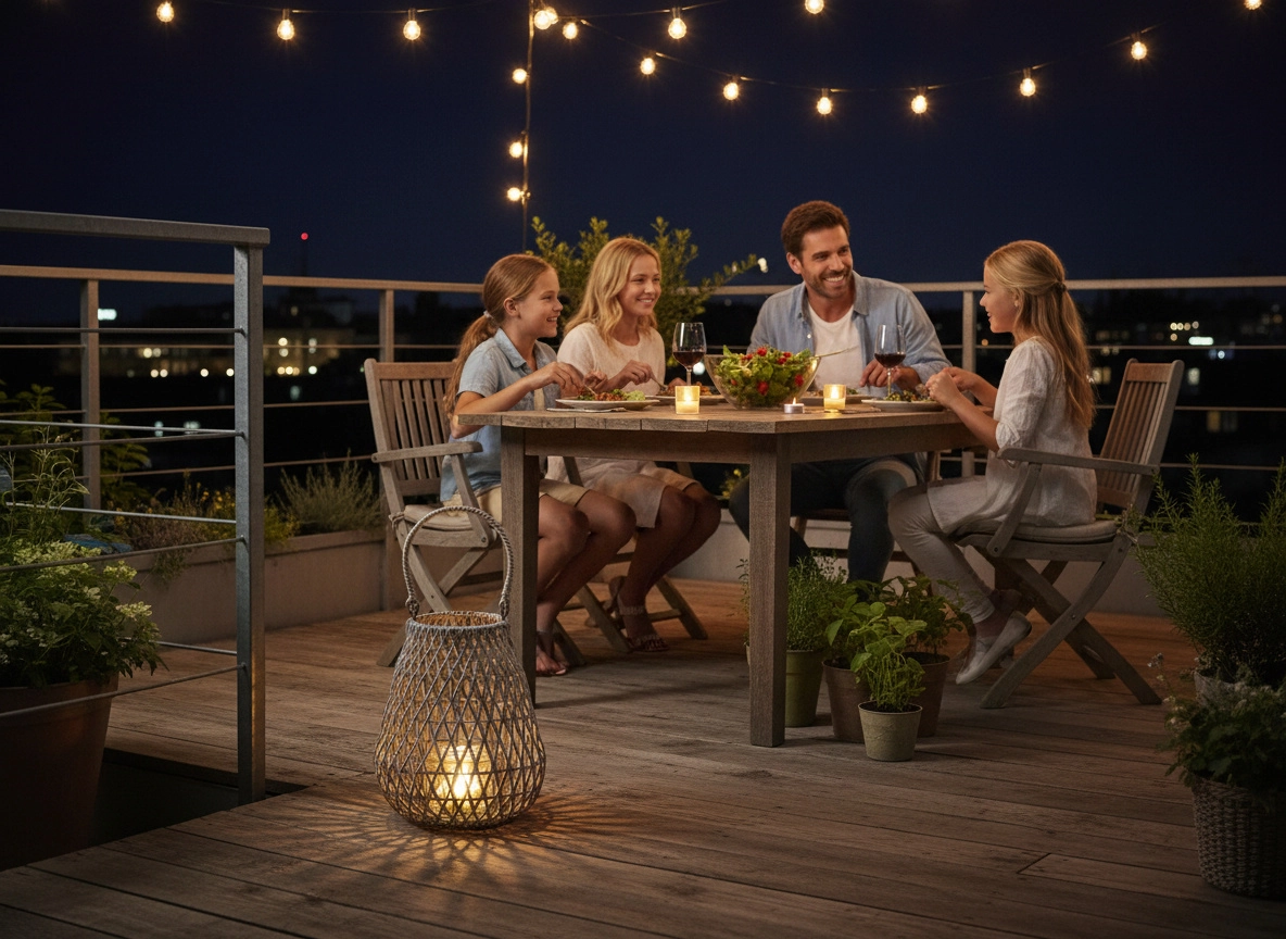 Mânerul robust permite transportul sau agățarea confortabilă. Ideal pentru terasă sau balcon la serile petrecute afară.