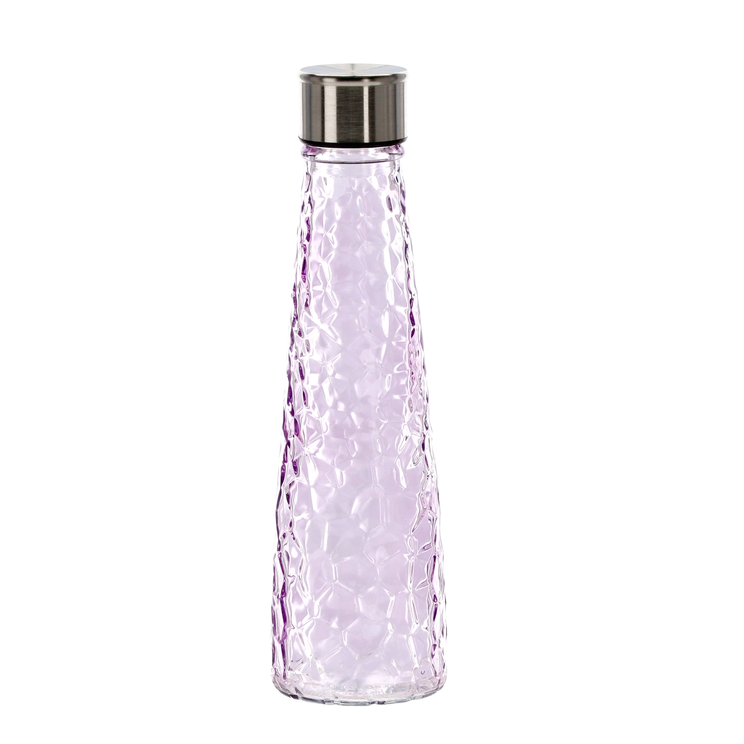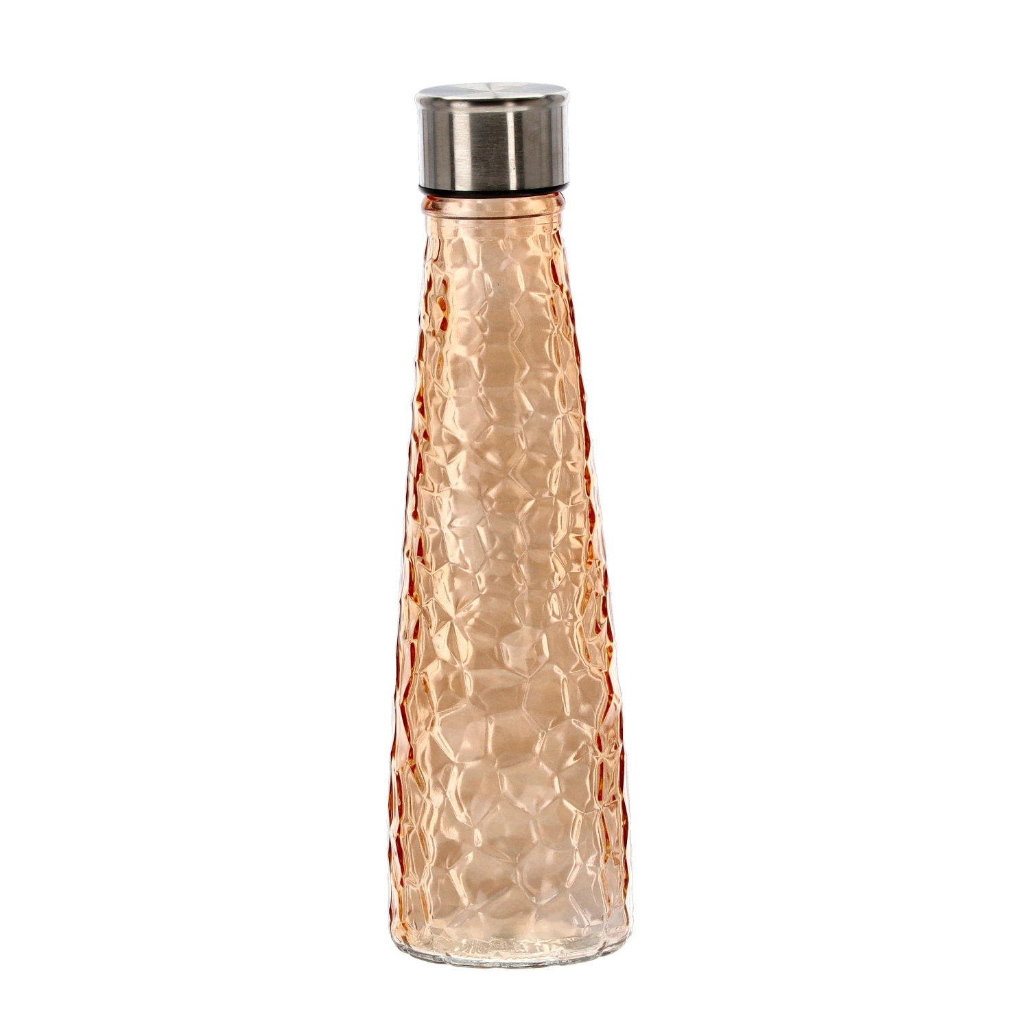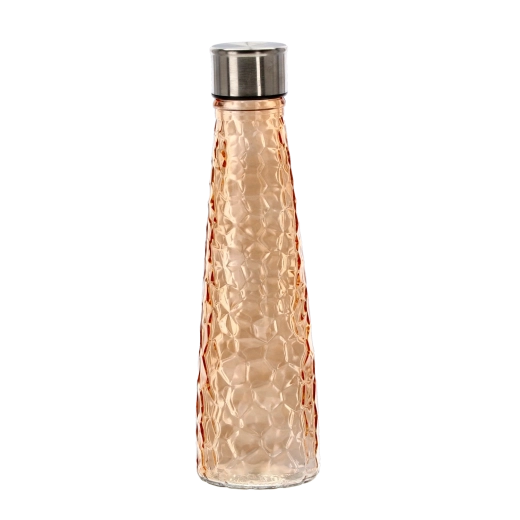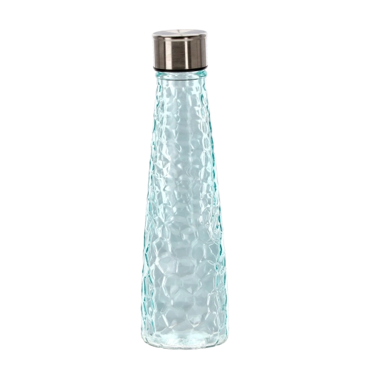 Această sticlă din sticlă de 0,5 litri îmbină designul elegant cu practicitatea. Corpul din sticlă rezistentă, cu un model fin tip ciocănit/facetat, se ține confortabil în mână și ajută la prevenirea alunecării. Capacul filetat din oțel inoxidabil etanșează în siguranță, astfel încât poți transporta sticla fără griji în geantă sau rucsac.