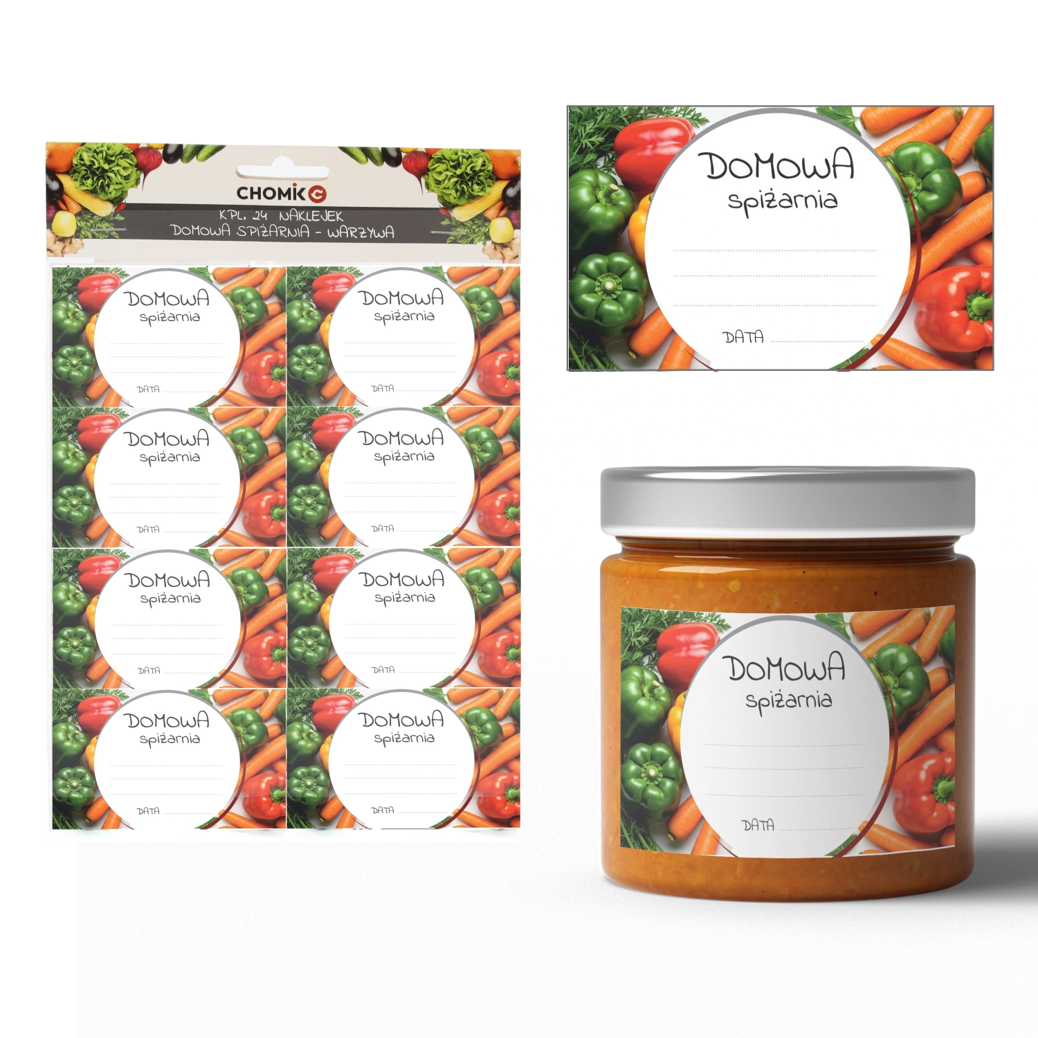 Organizează-ți cămara rapid și clar cu setul de 24 de autocolante pentru conserve cu motiv de legume. Fiecare etichetă oferă spațiu pentru denumirea conținutului și data, are material plastic rezistent și se aplică ușor datorită stratului autocolant. Designul estetic conferă borcanelor tale un aspect profesionist și te ajută să menții ordinea în provizii.