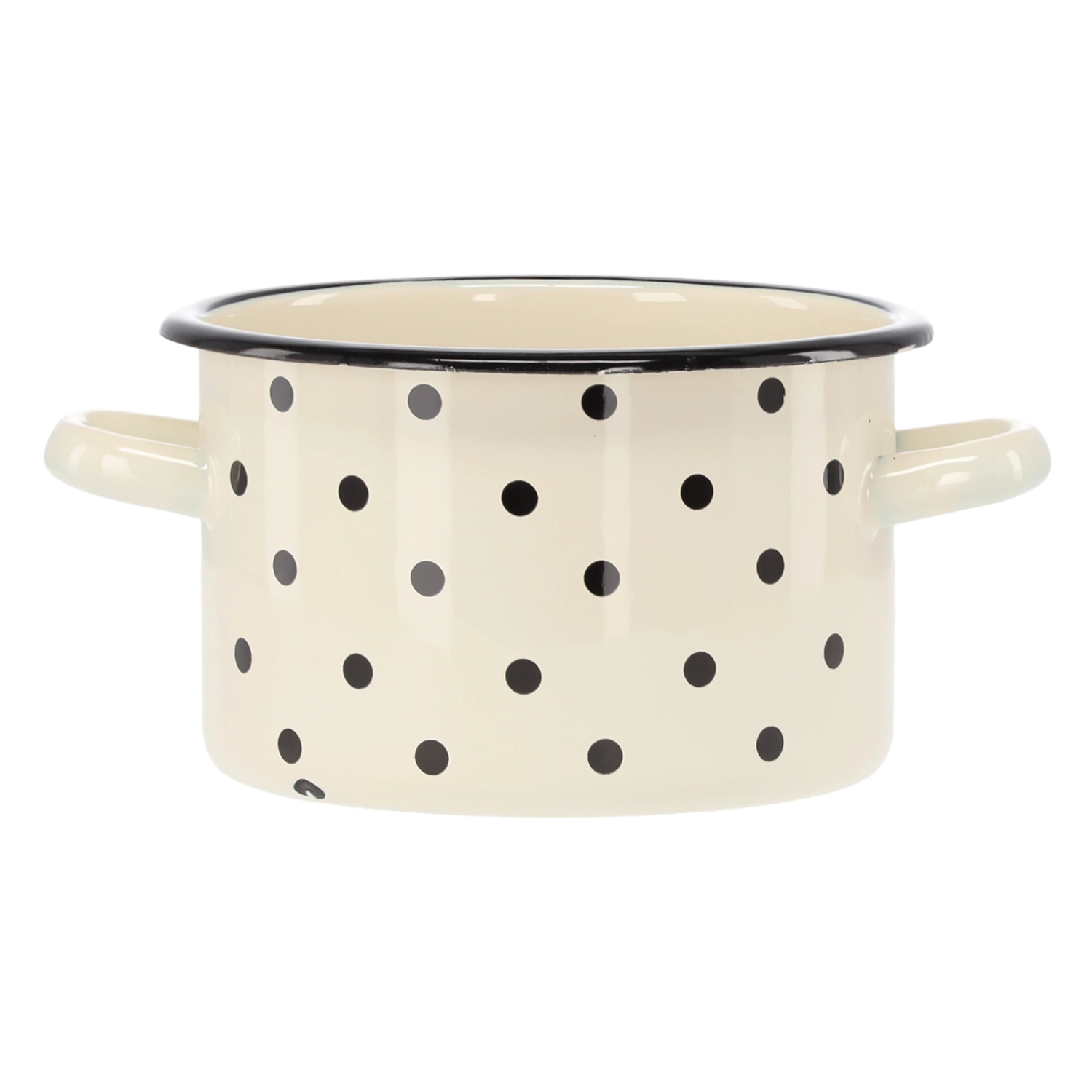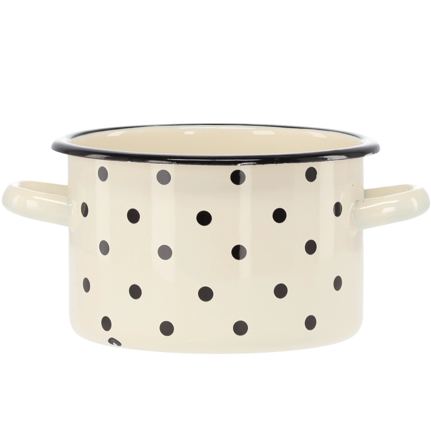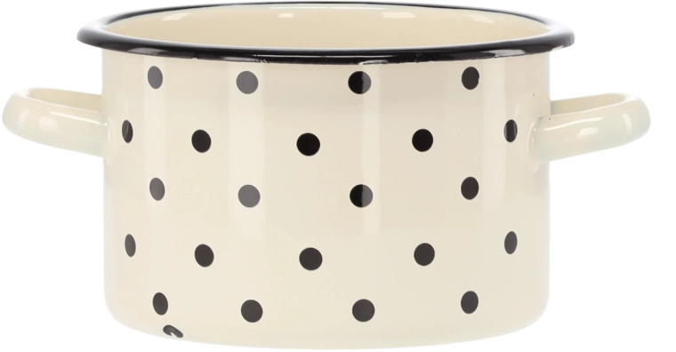Oală practică emailată cu volum de 2 l și diametru de 16 cm, în culoare albă elegantă cu buline decorative. Datorită suprafeței rezistente este durabilă, se întreține ușor și este ideală pentru gătitul zilnic.