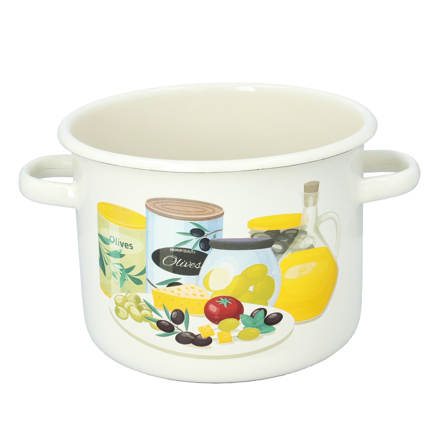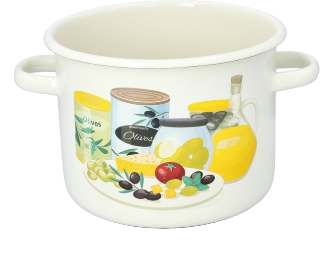 Oală practică emailată cu un volum de 4,5 l și un diametru de 20 cm, în elegantă culoare crem, cu motiv decorativ de măsline. Se remarcă prin rezistență, întreținere ușoară și este ideală pentru gătirea porțiilor mai mari de mâncăruri zilnice.