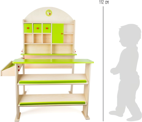Un stand de vânzare modern din lemn nu numai că dezvoltă abilitățile de comunicare și matematice ale copiilor, dar le și stimulează creativitatea. Este echipat cu spații de depozitare, care includ rafturi înclinate pentru depozitarea cutiilor și rafturi separate pentru articole și mărfuri. Peretele din spate conține suprafețe de depozitare și dulapuri cu uși funcționale. În partea de sus a standului sunt ceasuri pe care copiii le pot folosi pentru a învăța ora și pentru a marca orele de deschidere.