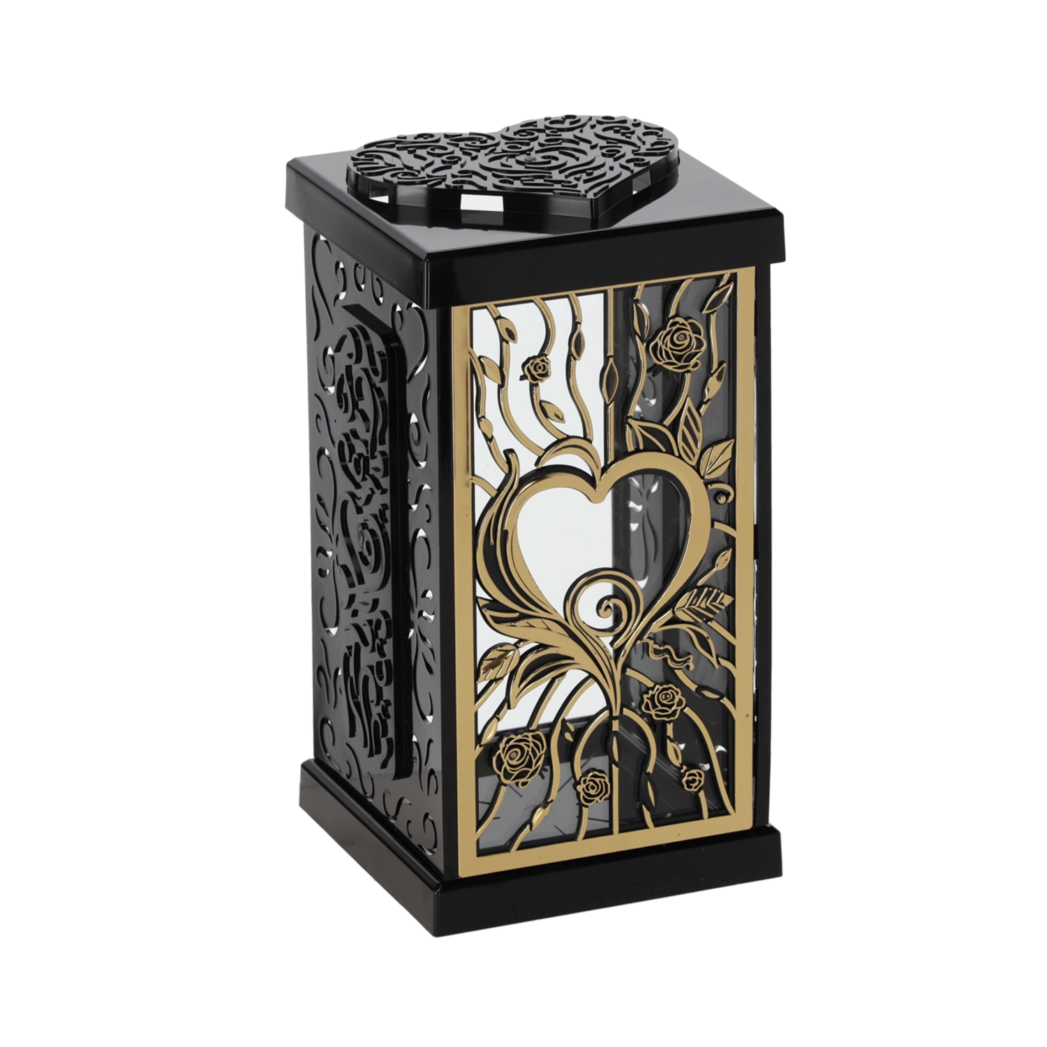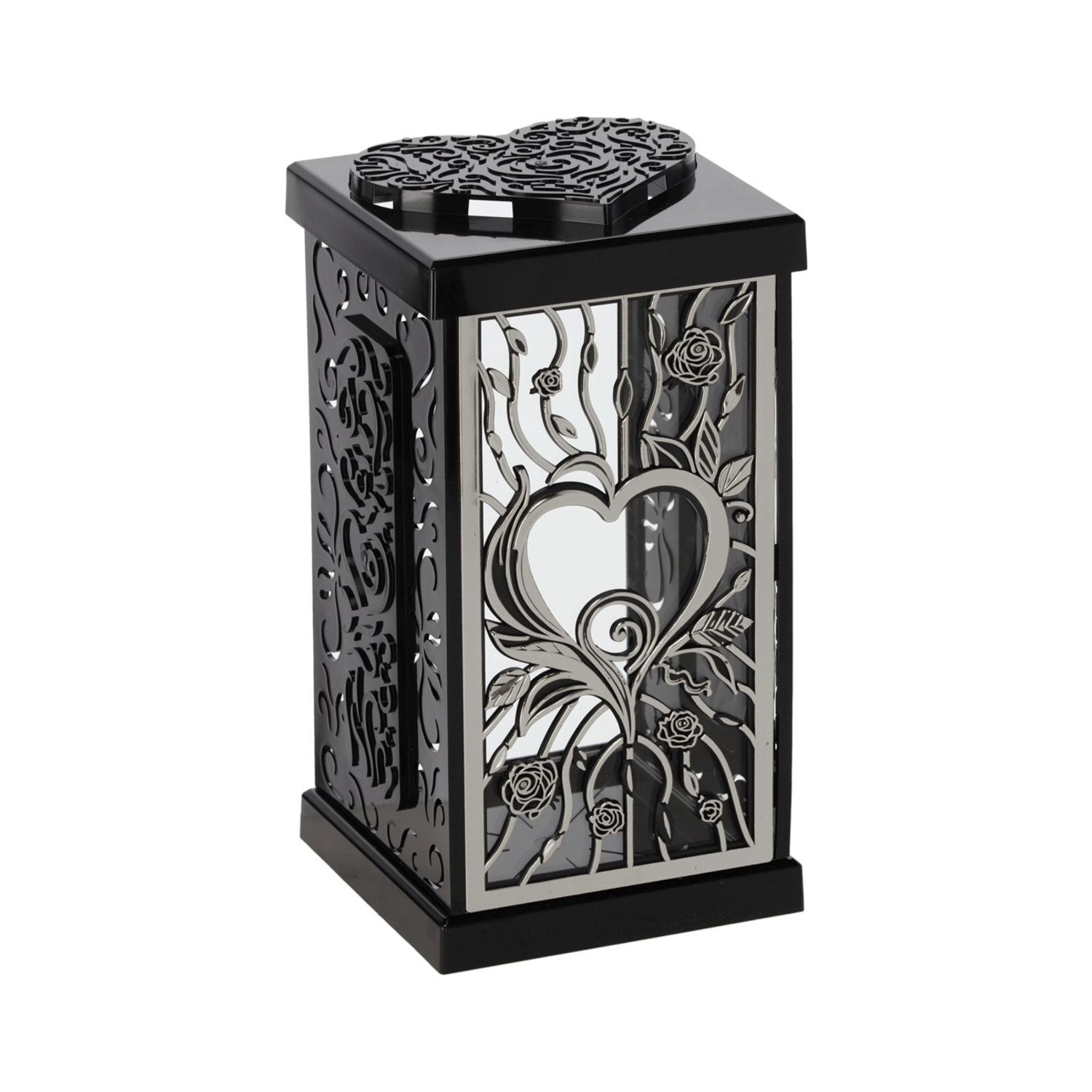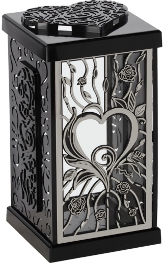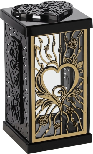 Acest lampion stilat, cu motivul trandafirului mare, oferă locului de aducere‑aminte o atmosferă demnă și elegantă. Datorită designului atemporal în tonuri negru‑argintiu sau negru‑auriu, se potrivește frumos cu diverse tipuri de monumente și decorațiuni.