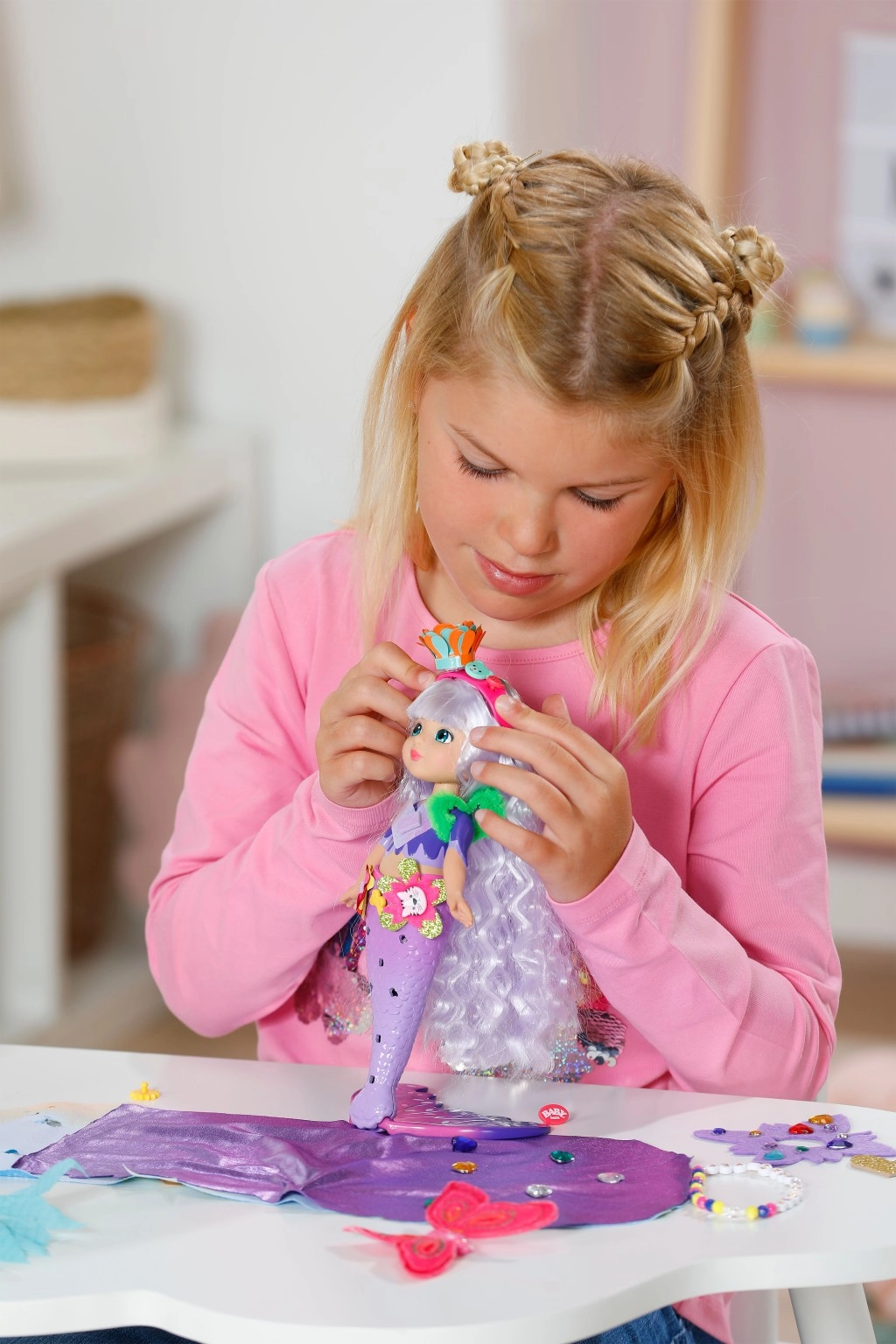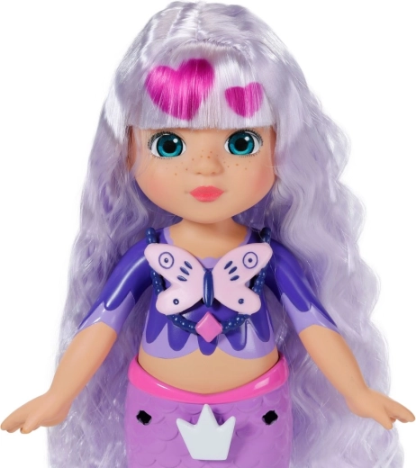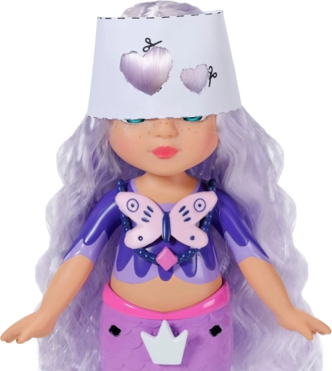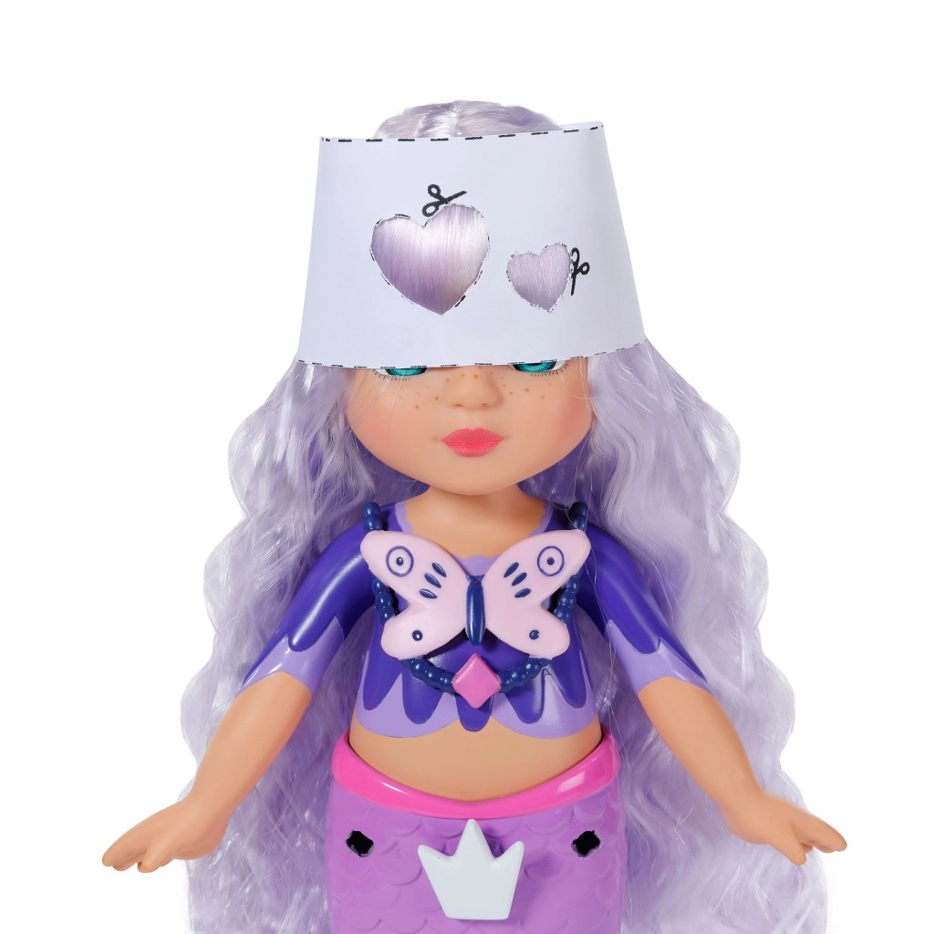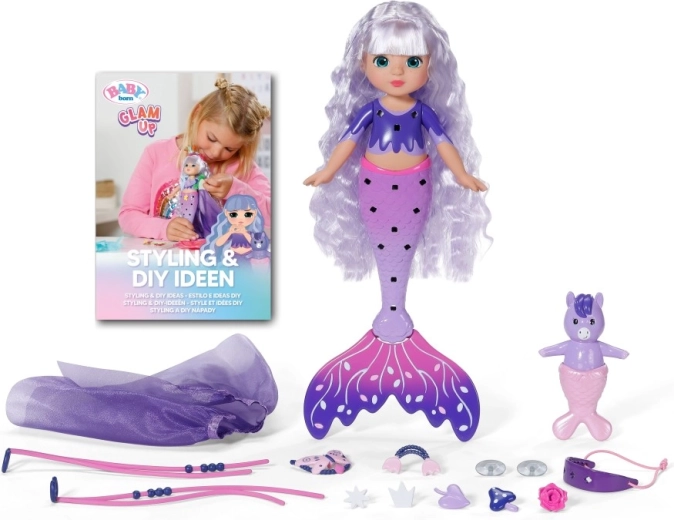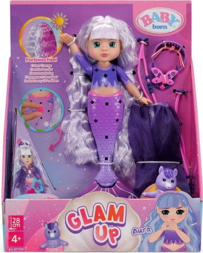 Descoperă lumea creativității cu păpușa BABY born sirenă Aura din gama Glam Up. Datorită efectului UV magic, părul ei lung mov își schimbă culoarea la soare, în timp ce o poți pieptăna, decora și coafa din cap până la coadă. În pachet găsești accesorii textile, decorațiuni colorate cu clips, un prieten animal drăgălaș și un jurnal plin de inspirație – în fiecare zi ia naștere un look nou și original.