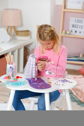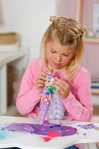 Păpușa poate fi pieptănată, decorată și accesorizată – combină accesoriile textile și decorațiunile cu clips pentru variații nelimitate.