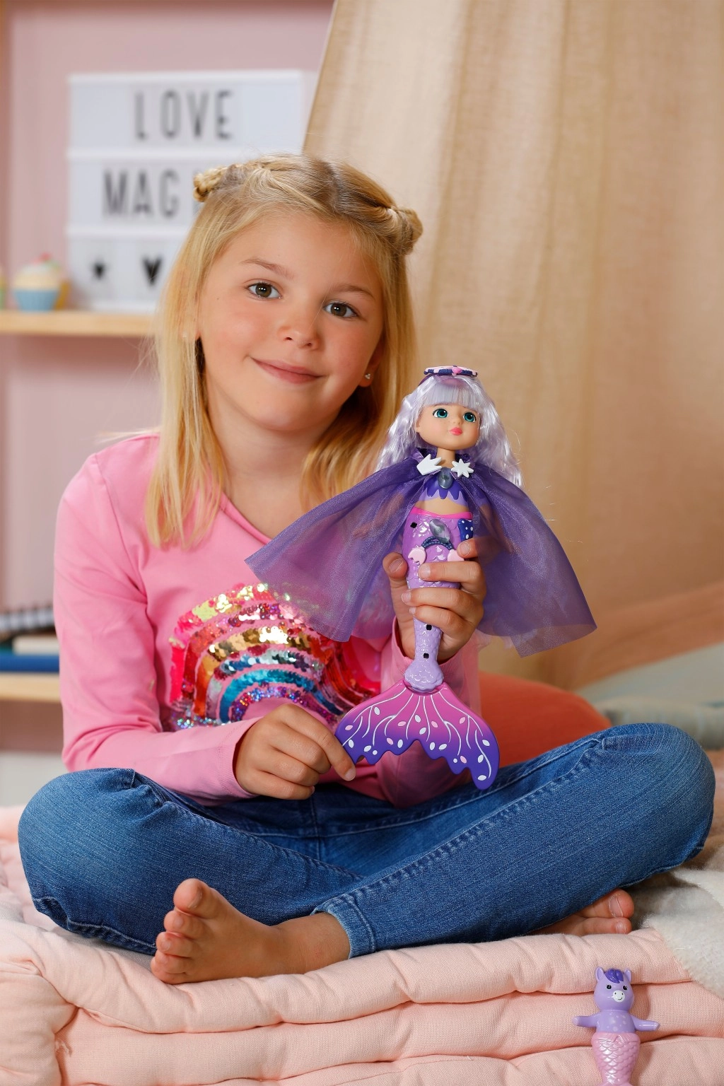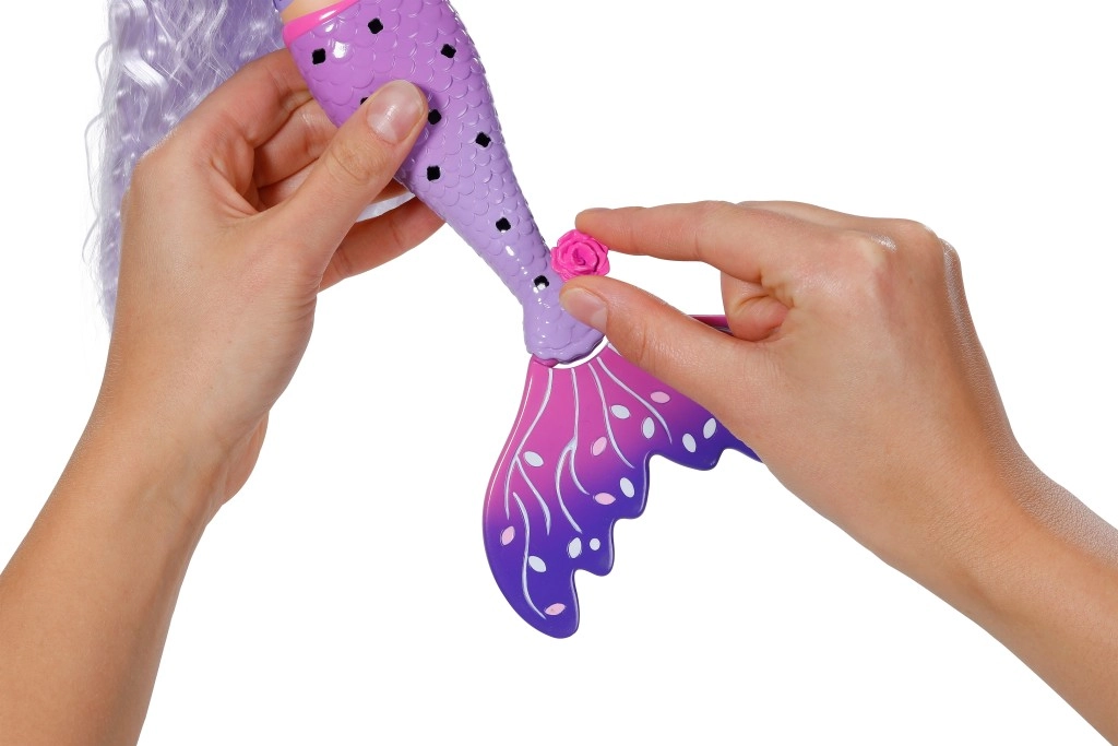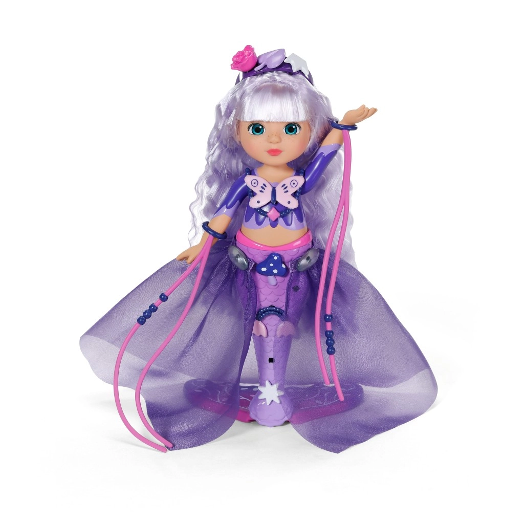 Sirena Aura le oferă copiilor posibilități nesfârșite de creație. Părul ei lung mov, cu magie UV, își schimbă nuanța la lumina soarelui și asigură un efect wow instantaneu. Datorită setului bogat, copiii pot crea coafuri strălucitoare, decora coada și ținuta și imagina povești originale din lumea subacvatică.