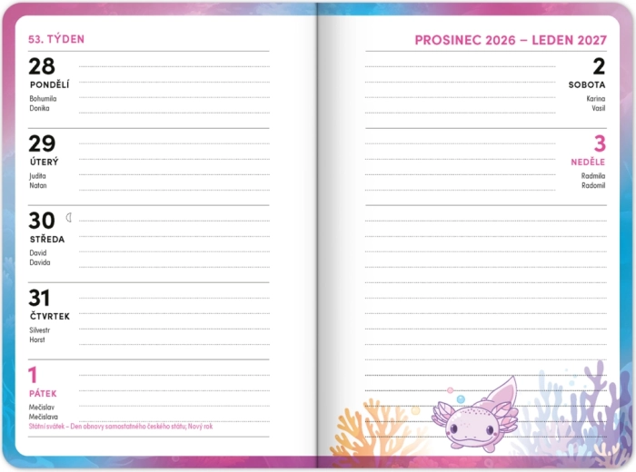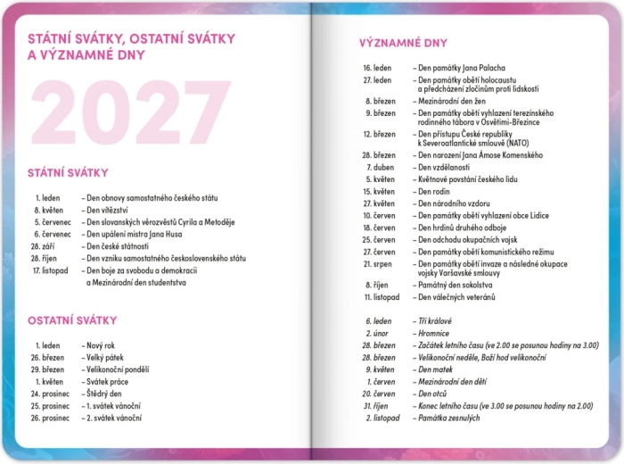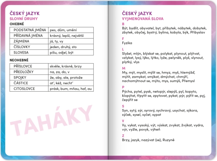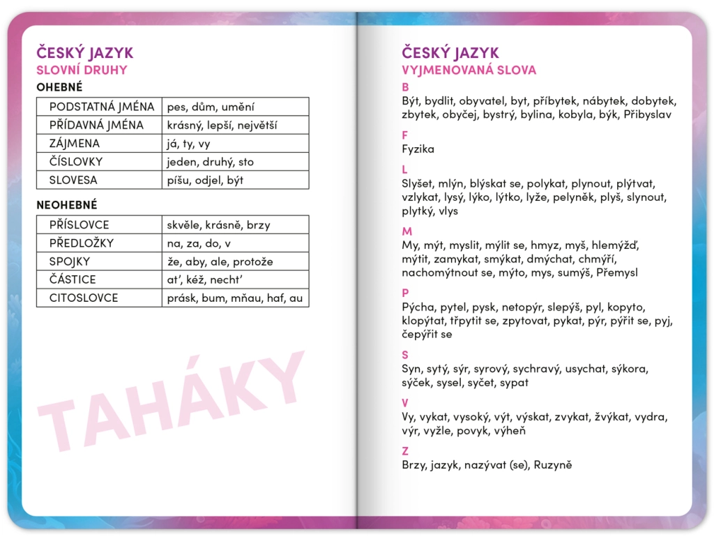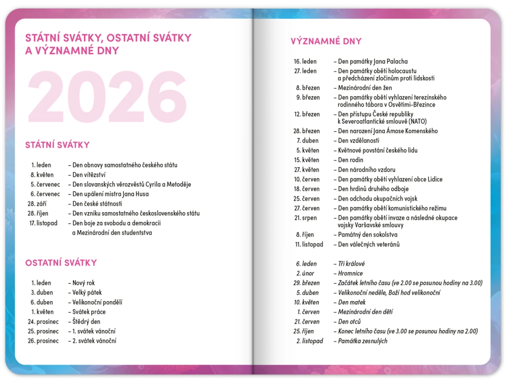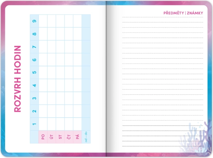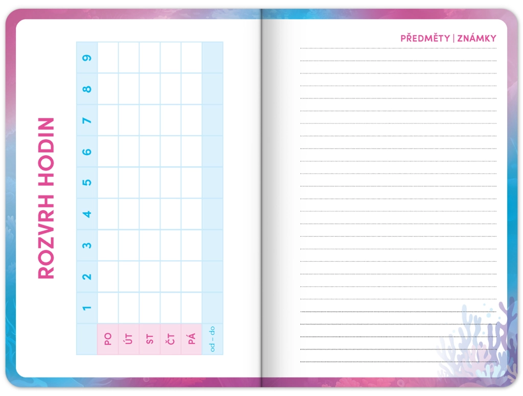 Agenda este concepută pentru a economisi timp și a sprijini studiul. Găsești în ea fițuici la limba cehă, matematică și engleză, orare practice și prezentarea termenelor vacanțelor. Ideală pentru elevii care vor să aibă totul important într-un singur loc.