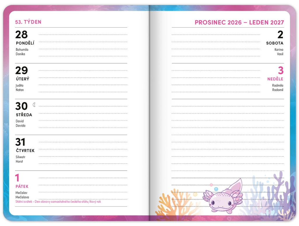 Păstrează-ți ordine în sarcinile școlare cu agenda școlară cu motiv Axolotl. Datorită dimensiunilor compacte de 9,8 × 14,5 cm încape în orice ghiozdan sau rucsac, iar structura clară, din septembrie 2026 până în decembrie 2027, ușurează planificarea examenelor, temelor și a timpului liber.