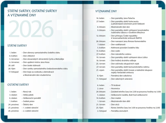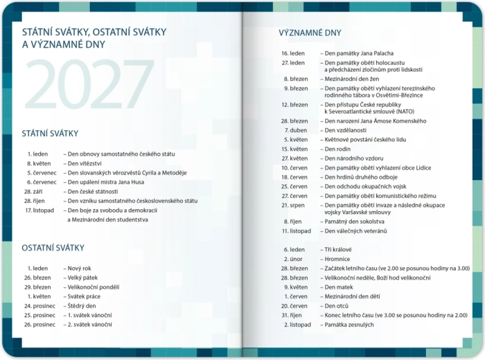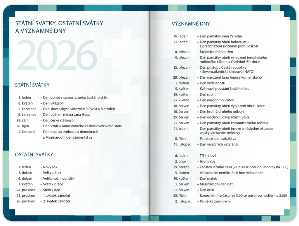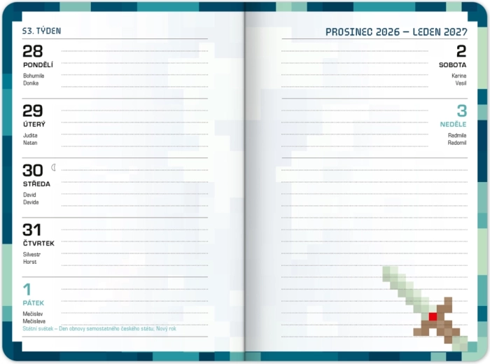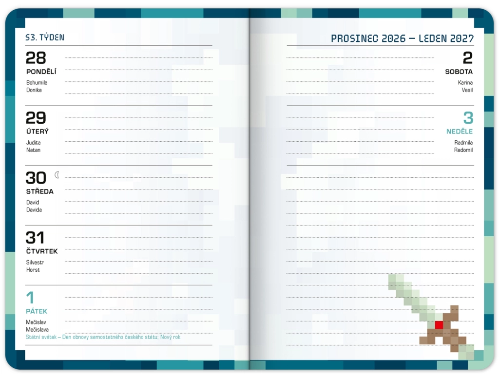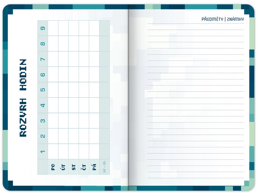 Agendă școlară stilată cu motiv de joc video de construcție pentru un an școlar clar organizat, din septembrie 2026 până în decembrie 2027. Oferă fițuici practice la limba cehă, matematică și engleză, orar și prezentarea vacanțelor într-un format compact 9,8 × 14,5 cm – ideală pentru rucsac sau geantă.