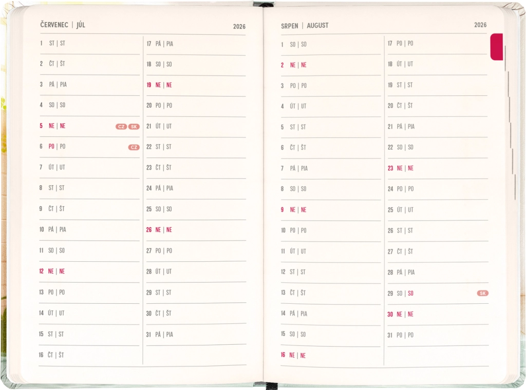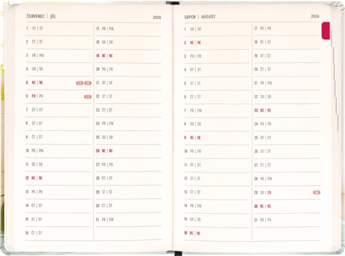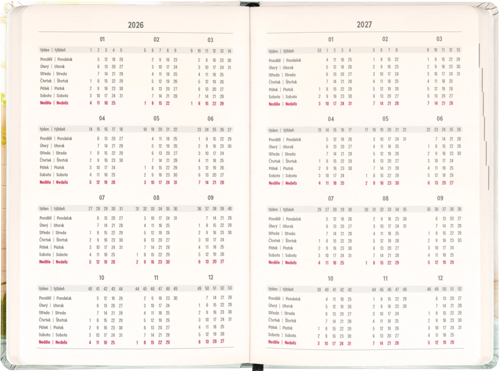 Agenda practică și stilată Notique Petito cu motiv capibară oferă planificare pe 18 luni din iulie 2026 până în decembrie 2027. Include calendar săptămânal pe coloane cu nume și onomastice, vederi generale pentru anii 2026 și 2027 precum și listă de nume cehe și slovace. Dimensiunea compactă de 11 × 16 cm încape în geantă sau rucsac și este ideală pentru fiecare zi.