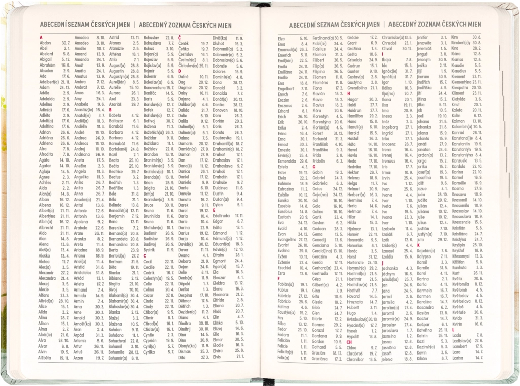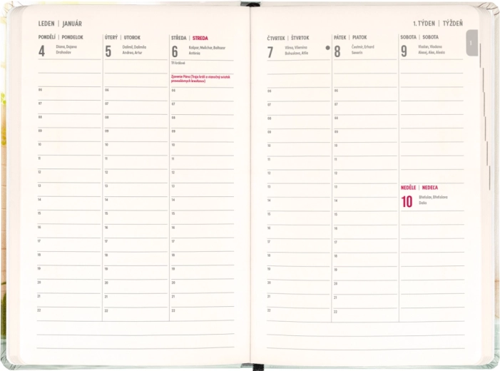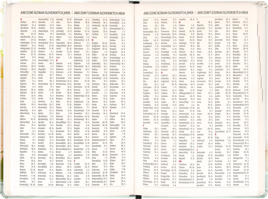 - Săptămânal pe coloane, ceho‑slovac cu nume și onomastice