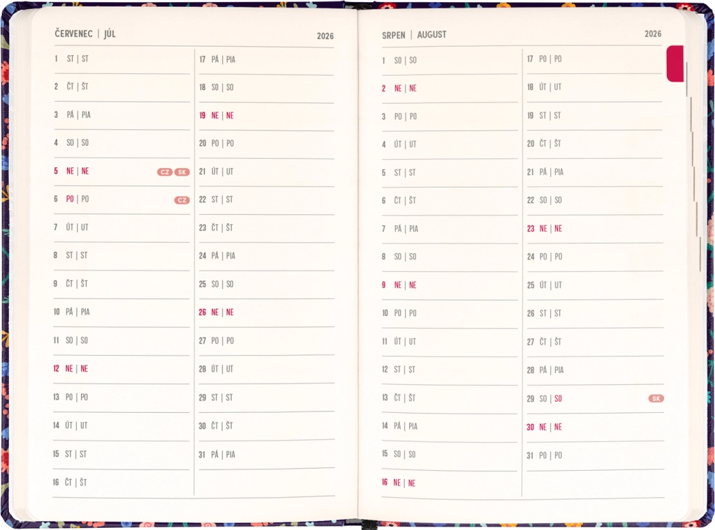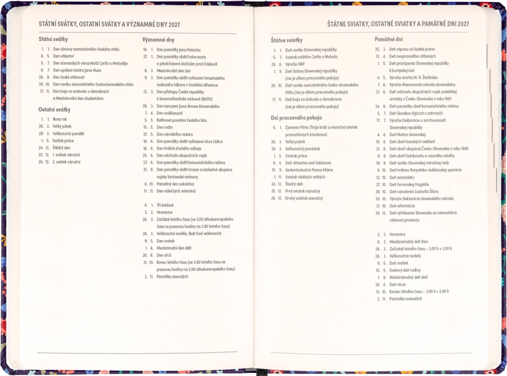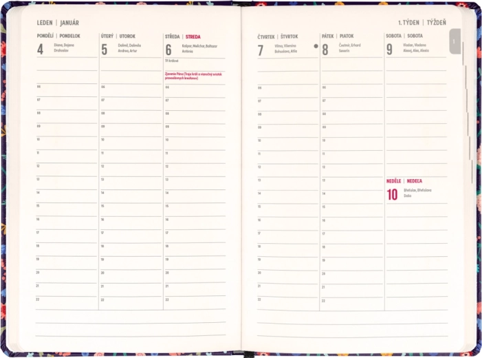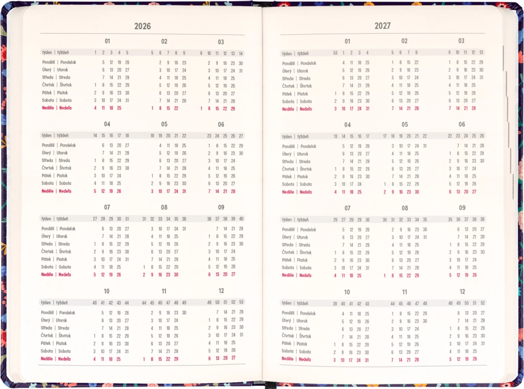 Agenda stilată Notique Petito Flora îmbină structurarea practică a săptămânilor pe coloane cu un design floral delicat. Datorită prezentărilor pentru anii 2026 și 2027 și listei de nume cehe și slovace, veți avea mereu la îndemână sărbătorile și planificarea.