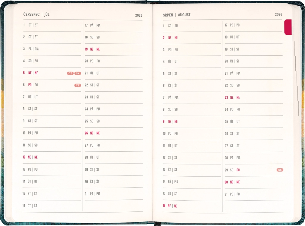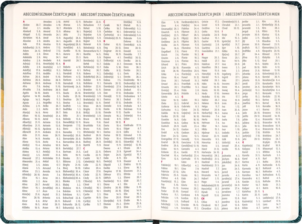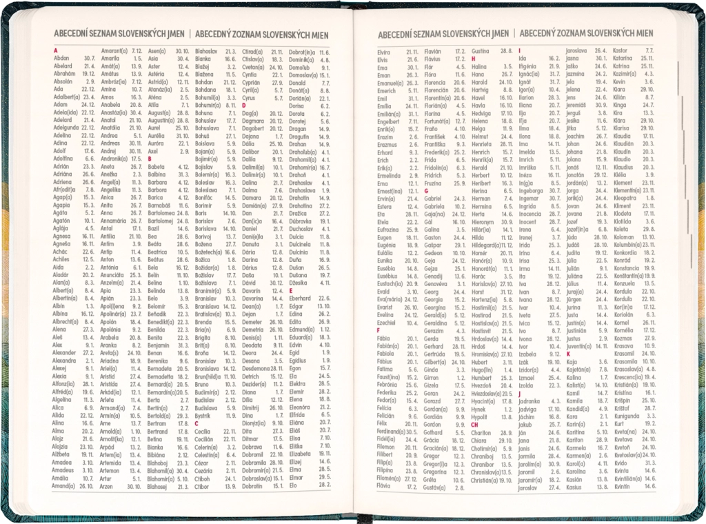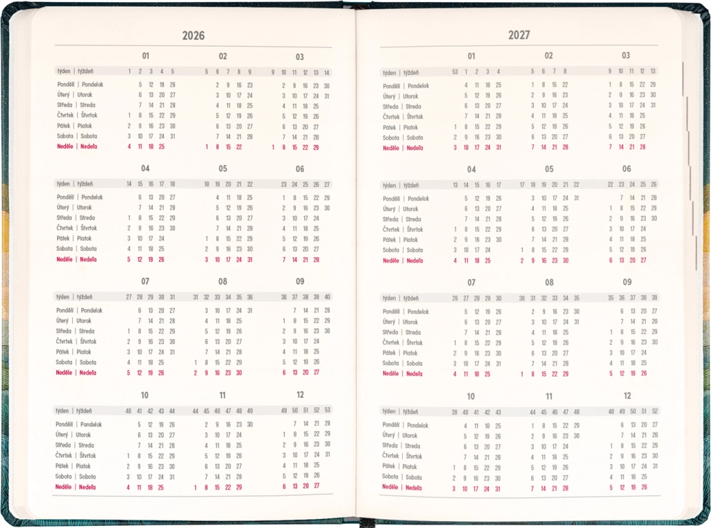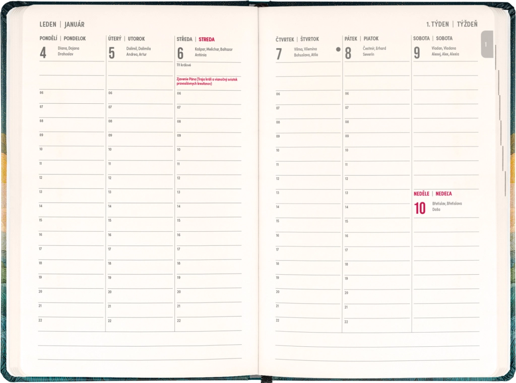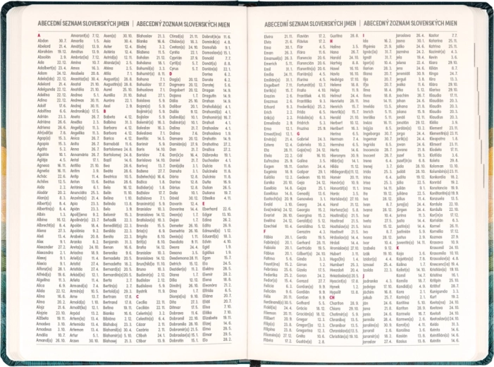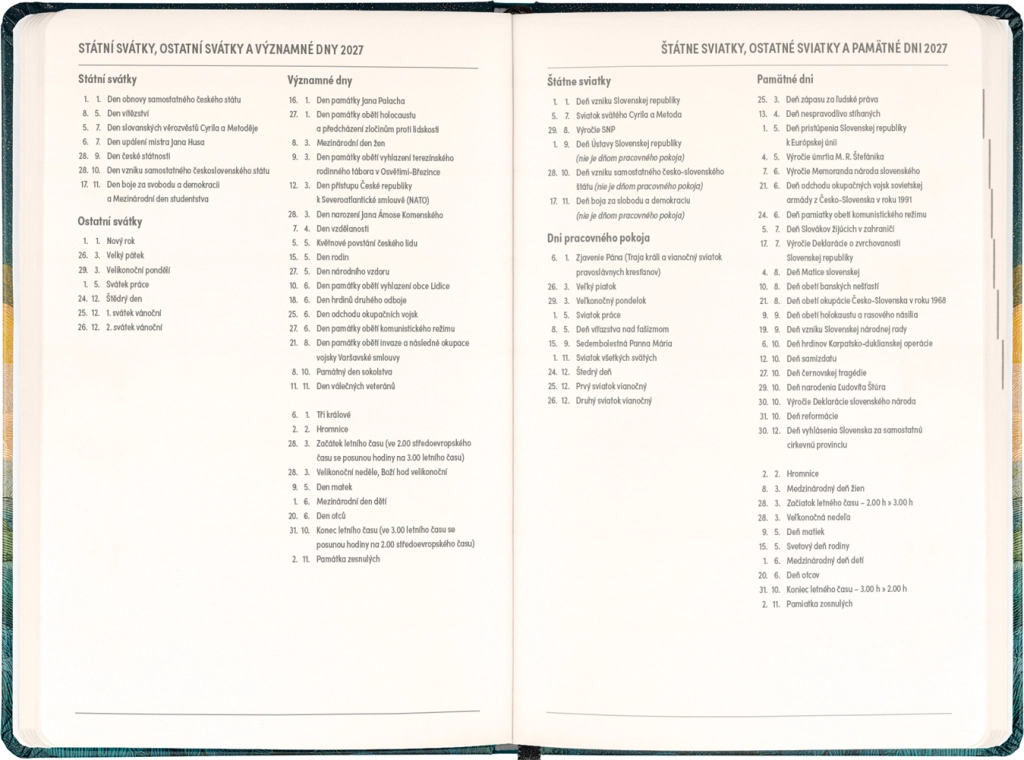 Dispunerea săptămânală în coloane, în calendarul ceho‑slovac, permite notarea rapidă a sarcinilor, întâlnirilor și termenelor. Sunt incluse, de asemenea, lista numelor cehe și slovace și sărbătorile marcate, pentru a avea mereu o vedere de ansamblu.