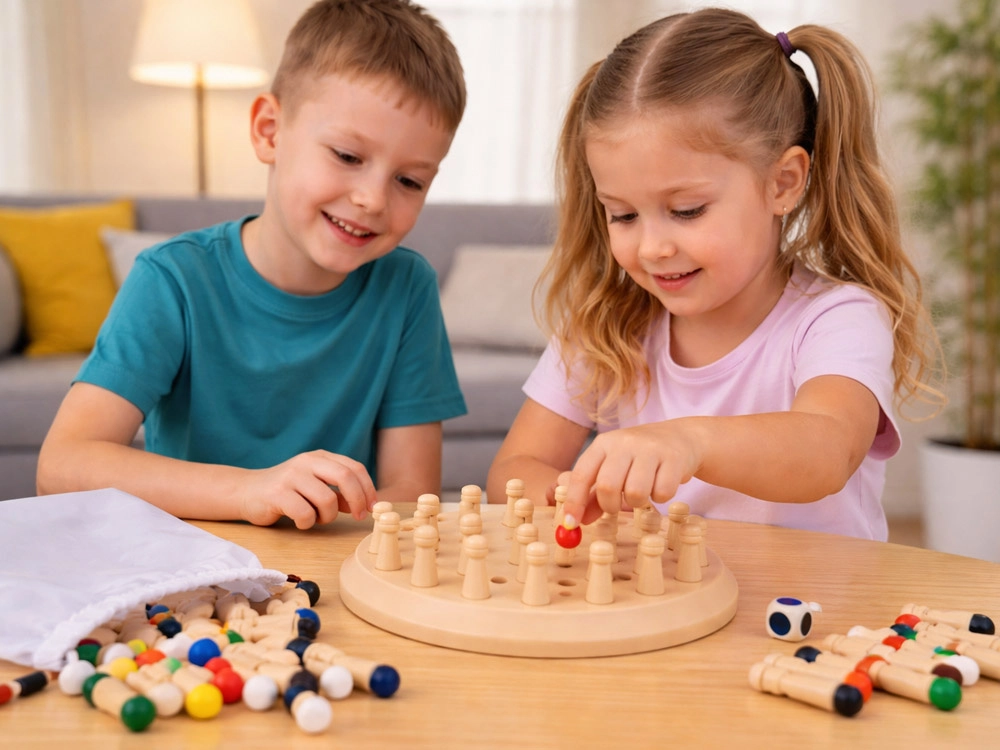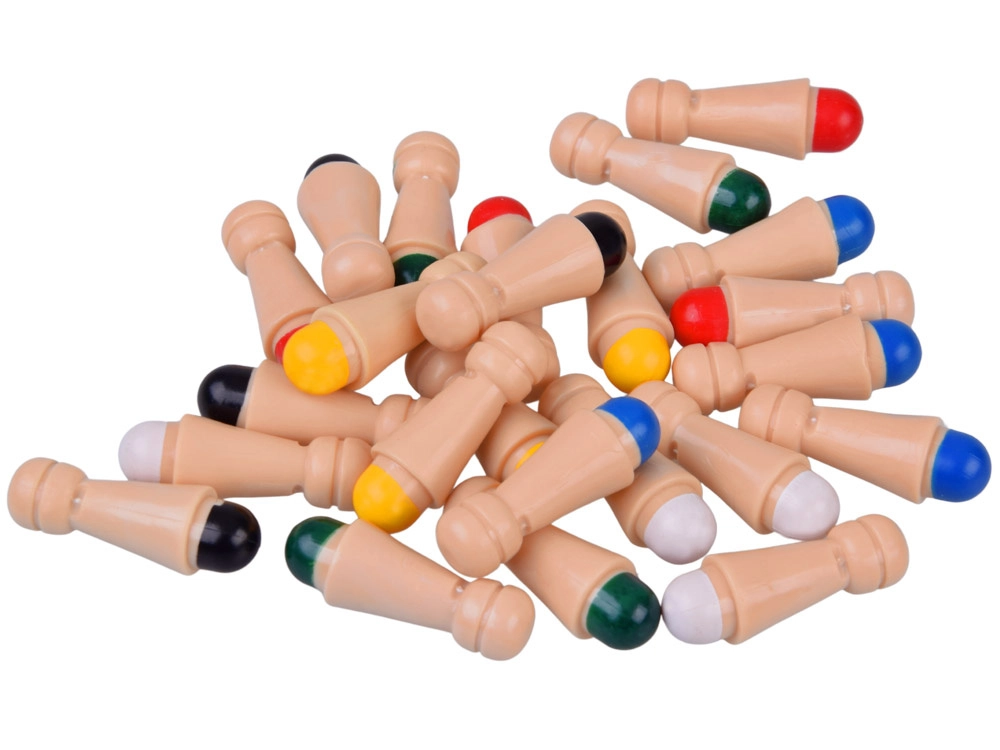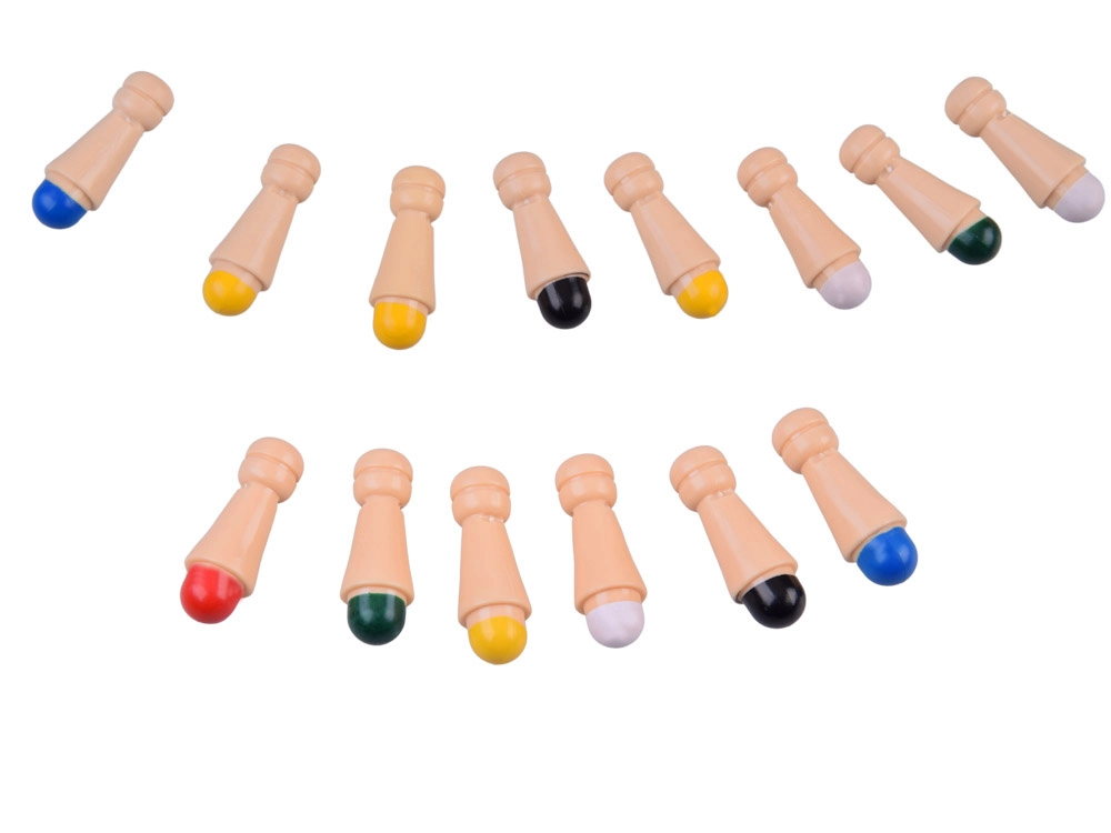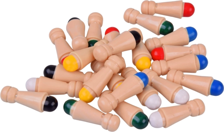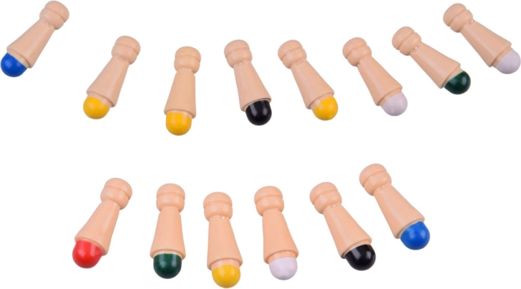 Regulile pot fi ușor adaptate: câștigă cel care adună primul 4 știfturi de aceeași culoare, sau cel care obține 6 culori diferite, ori jucătorul cu cel mai mare număr de știfturi la finalul jocului. Lemnul natural, finisajul neted și săculețul textil practic pentru depozitare fac din acest joc un partener rezistent pentru joaca de zi cu zi.