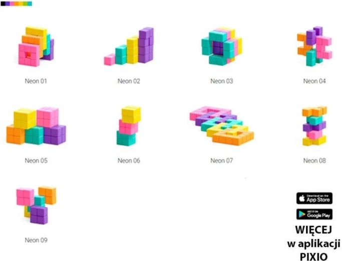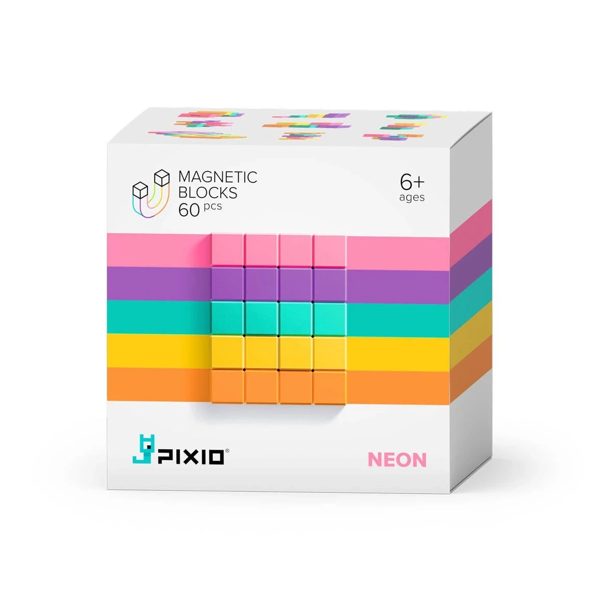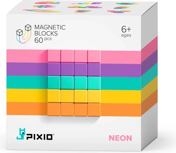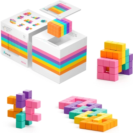 Setul PIXIO Neon 60 aduce culori intense (turcoaz, galben, portocaliu, roz, mov) și cuburi magnetice compacte, care se îmbină intuitiv. Copiii pot construi cu ușurință structuri 3D, pot încerca modele abstracte și își pot dezvolta imaginația și gândirea logică. Datorită marginilor netede și suprafeței plăcute, manipularea este confortabilă.