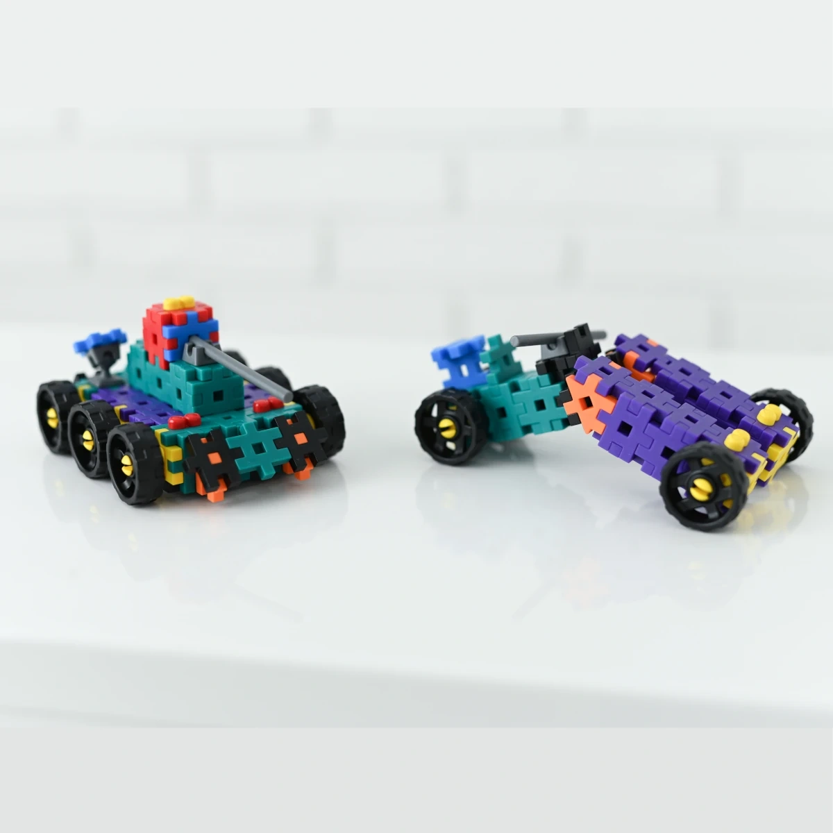 Roțile, axele și conectorii dezvoltă înțelegerea bazelor mecanicii. Copiii își exersează logică, planificarea și motricitatea fină într-un mod distractiv.
