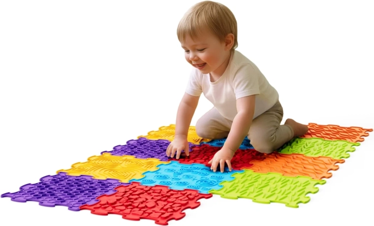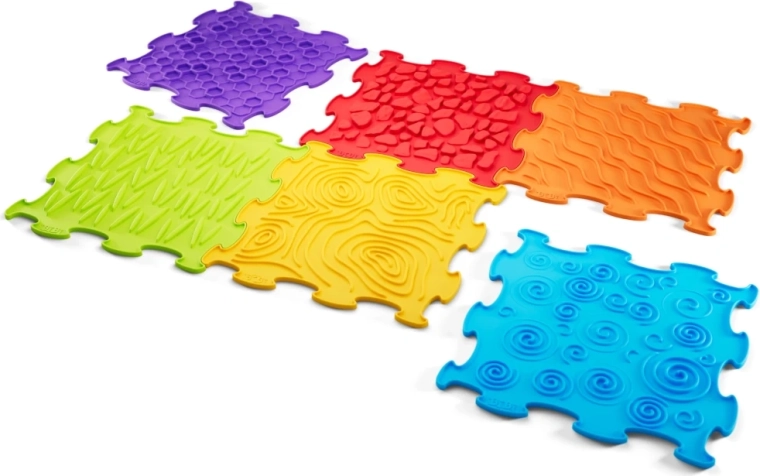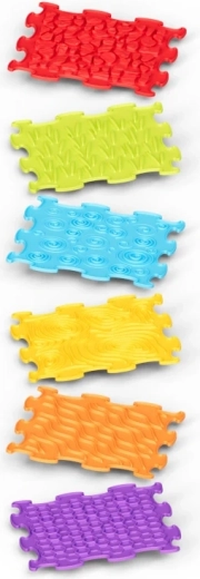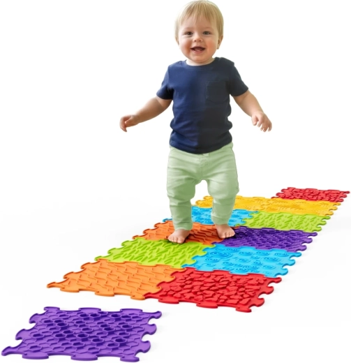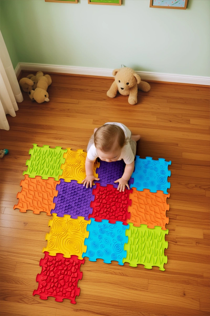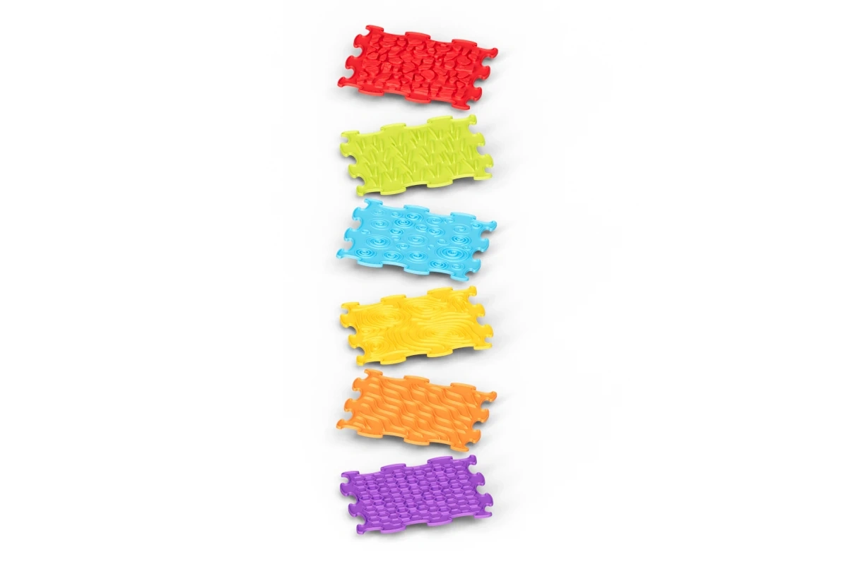 Fiecare plăcuță oferă o suprafață unică (valuri, spirale, pietricele, fagure) pentru o stimulare tactilă bogată a mâinilor și tălpilor și pentru învățare distractivă prin atingere.