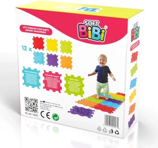 Setul colorat de 12 plăcuțe senzoriale interconectabile SOFT BIBI susține dezvoltarea simțului tactil, a motricității și a echilibrului la copiii de la 6 luni. Diferitele texturi (proeminențe, valuri, modele geometrice) invită la explorare cu mâinile și tălpile; plăcuțele se asamblează ușor în trasee senzoriale și sunt realizate din material moale și rezistent la apă pentru joacă în siguranță și curățare facilă.