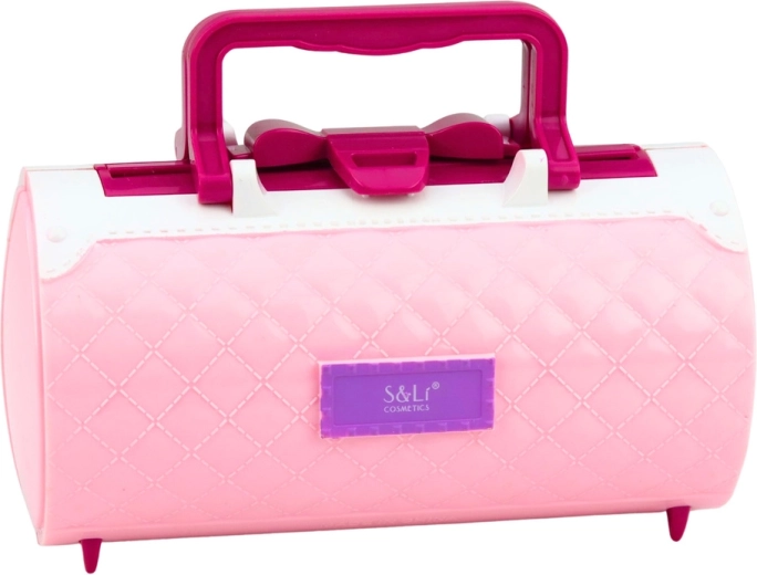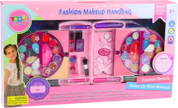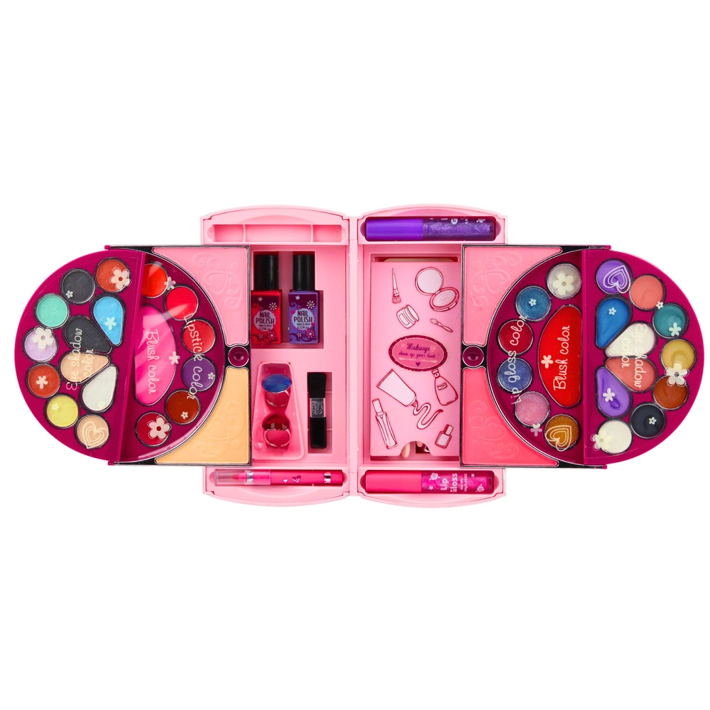 Un troller pliabil mare, roz, pentru micile iubitoare de machiaj aduce o trusă completă de machiaj pentru copii și accesorii pentru unghii. După deschidere, se transformă într-o paletă clar organizată cu farduri de pleoape, farduri de obraz, glossuri și lacuri, completată cu o oglindă sigură, aplicatoare și bureței. Cosmeticele sunt blânde cu pielea copiilor, ușor de spălat cu apă și parfumate fructat-dulce – ideale pentru joacă creativă și primii pași în lumea frumuseții.