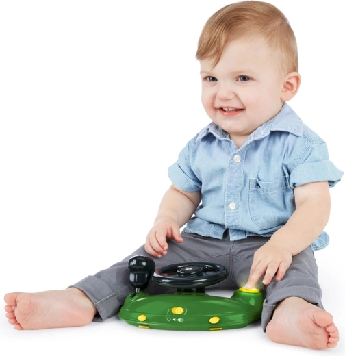 Volan, manetă de viteze, butoane, efecte luminoase și sunete realiste JOHN DEERE Gator stimulează imaginația și motricitatea fină.