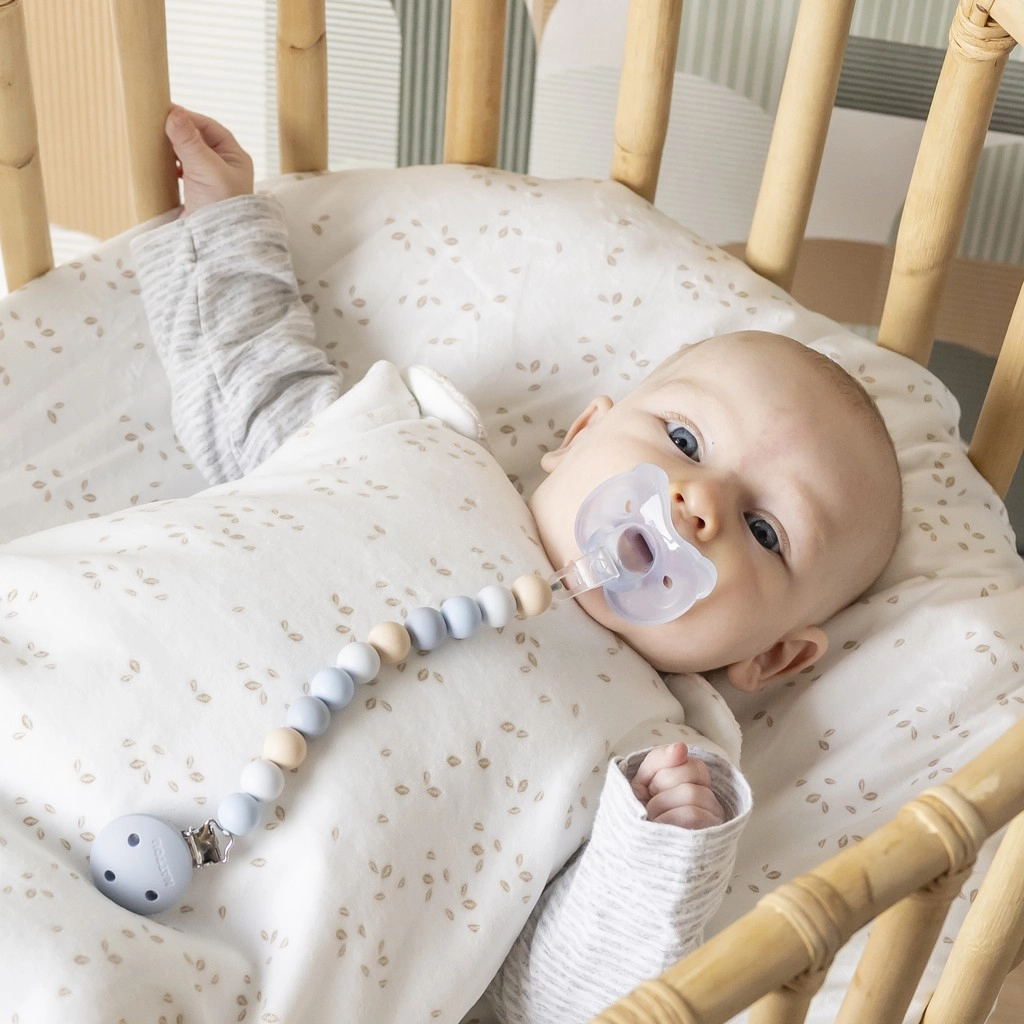 Agrafa metalică stă sigur pe haine sau pe sacul de dormit, astfel încât suzeta rămâne curată și mereu la îndemână – acasă sau la plimbare.