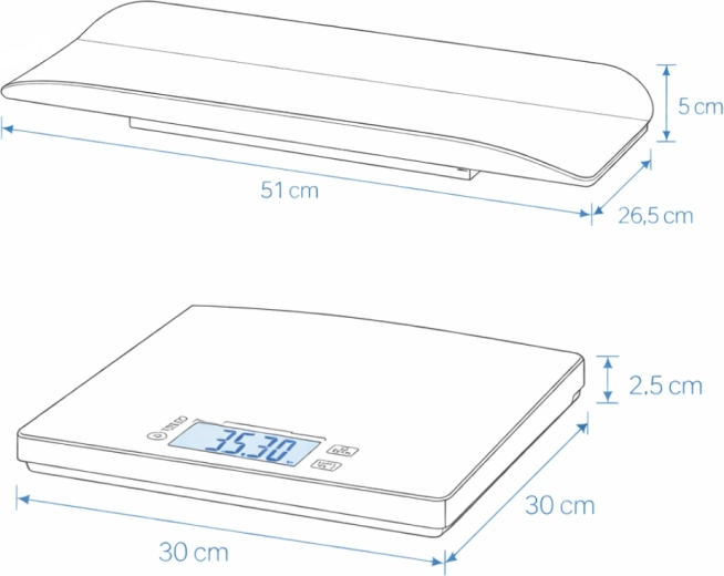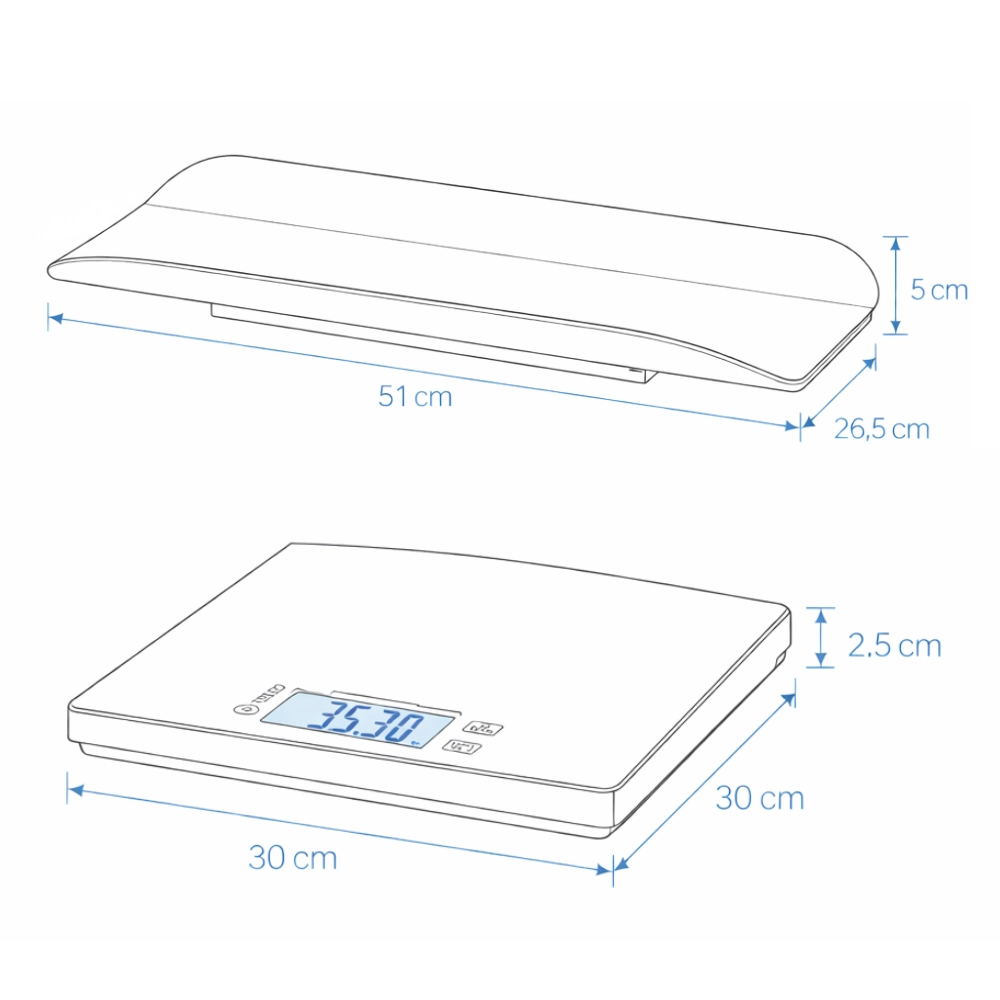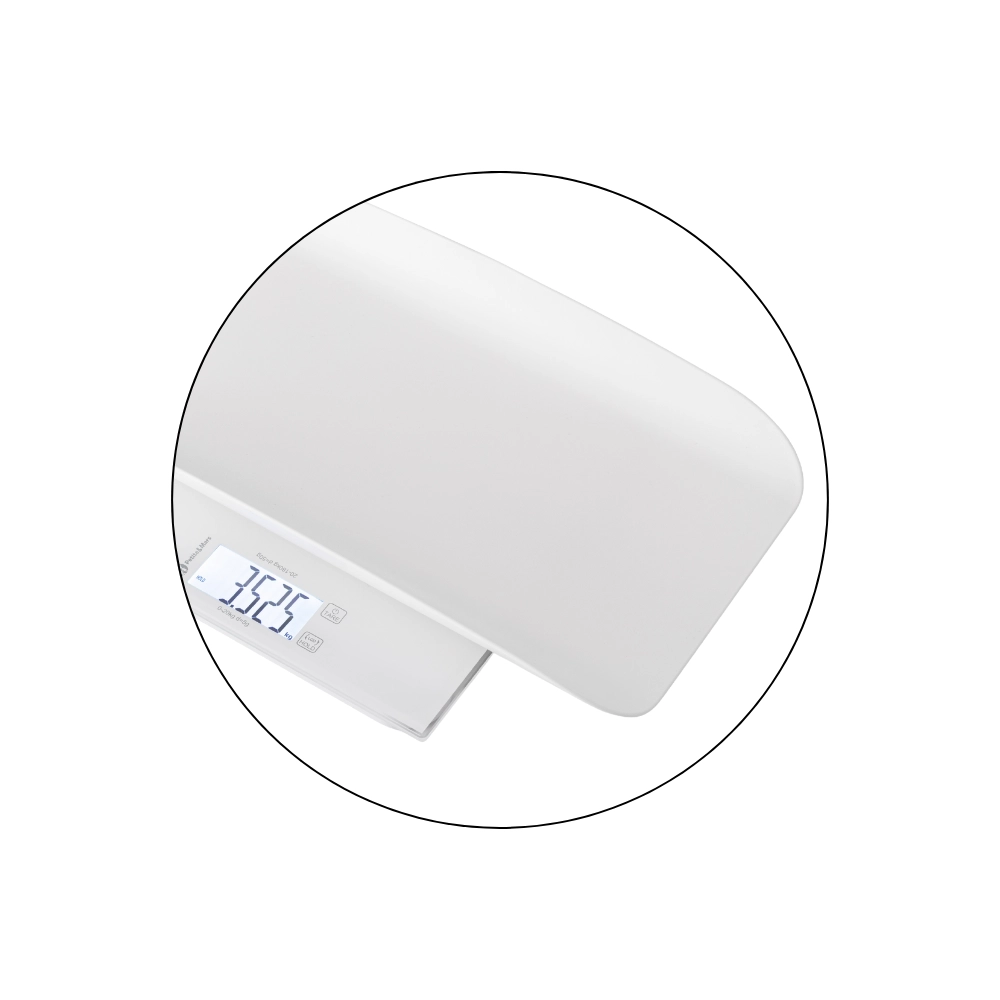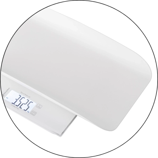Tăvița ergonomică din plastic oferă bebelușului stabilitate și confort. Dintr-o singură montare transformi cântarul obișnuit într-un cântar precis pentru nou-născuți, cu plajă de măsurare 0,1–20 kg.
