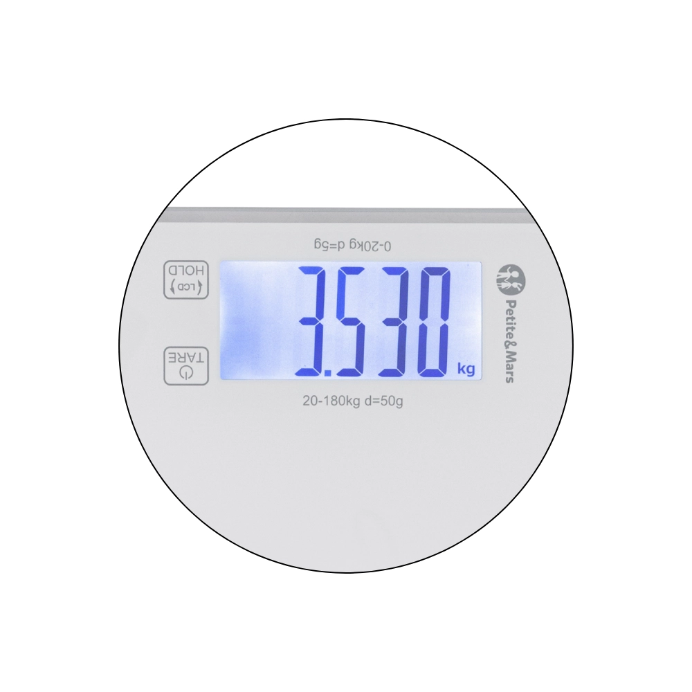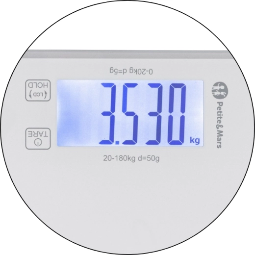Un singur cântar pentru întreaga familie. Cântarul digital Petite&Mars Libra 2în1 îți permite să urmărești comod greutatea bebelușului datorită tăviței spațioase și detașabile și, totodată, servește drept cântar de baie precis pentru adulți. Ecranul LCD mare, rotativ și iluminat asigură o lizibilitate excelentă din ambele părți, iar butoanele tactile oferă o utilizare ușoară și intuitivă.