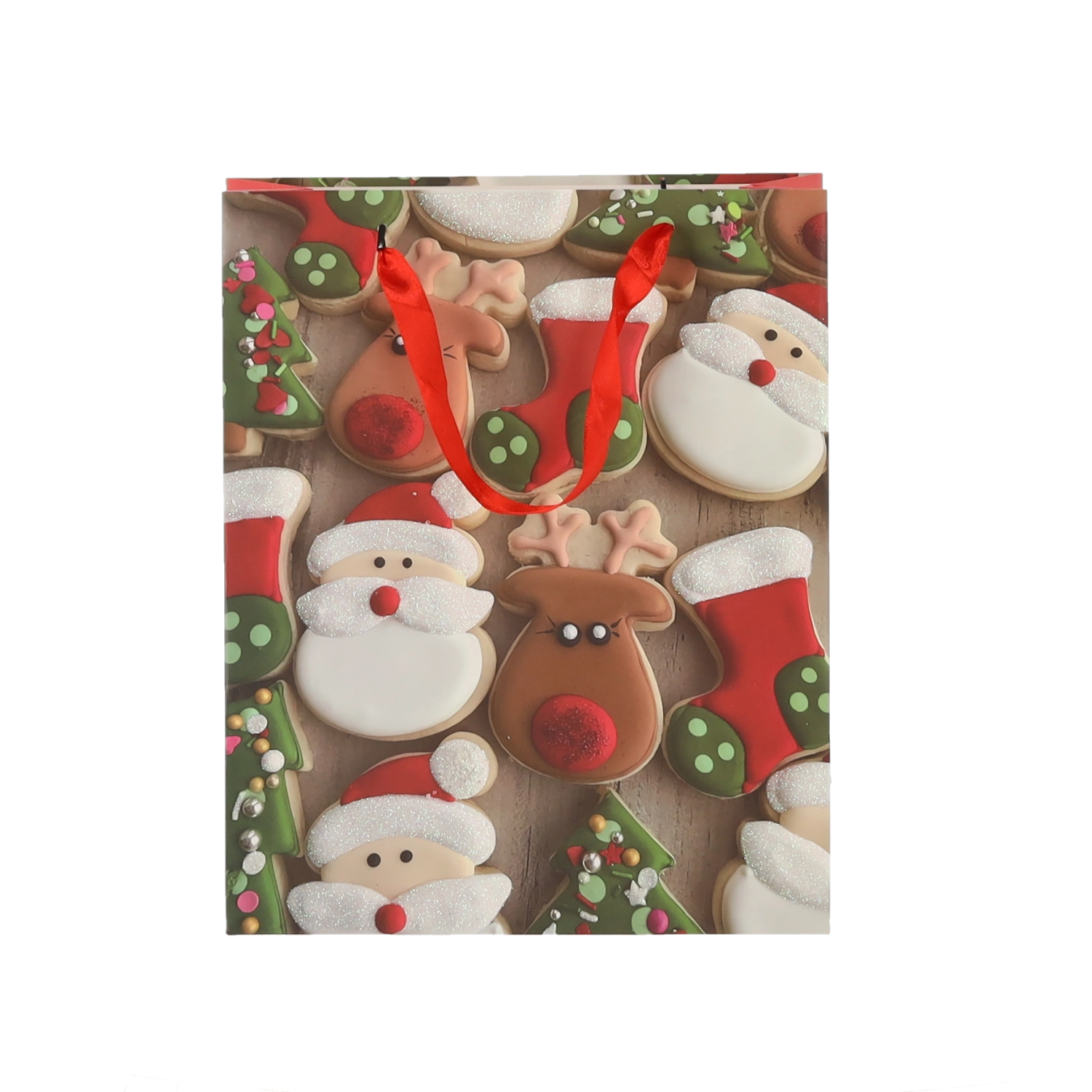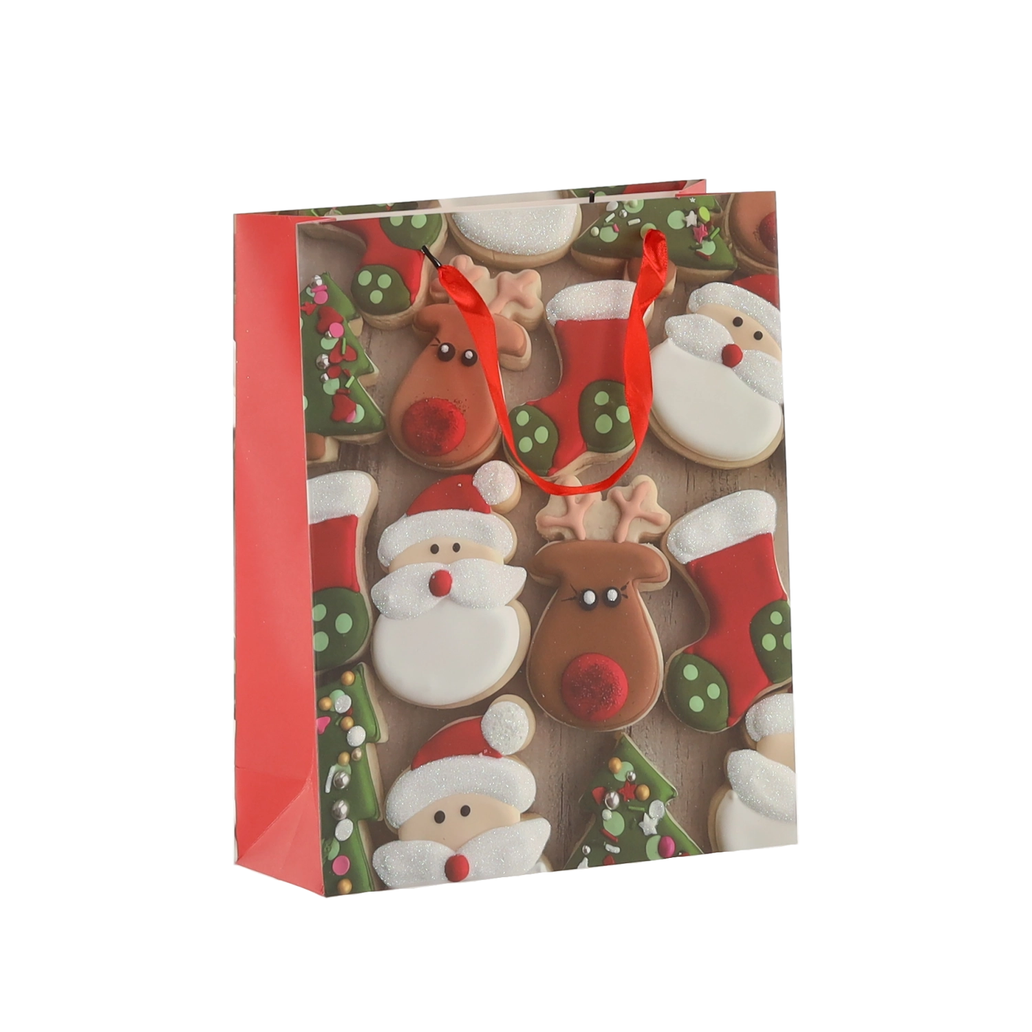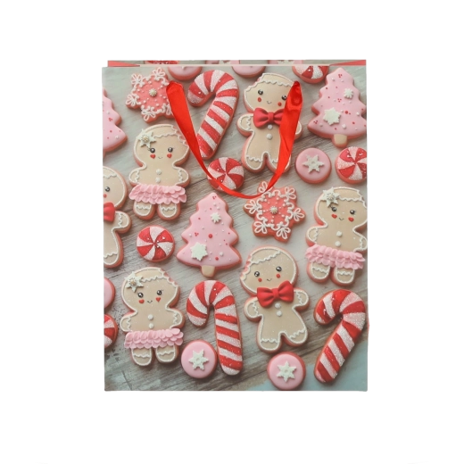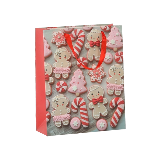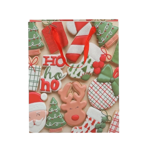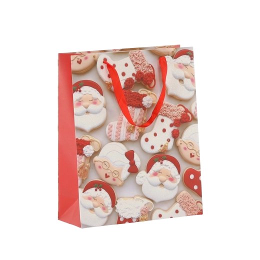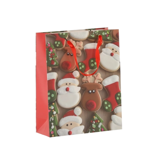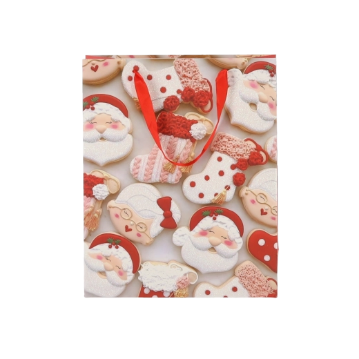 Set practic de 12 pungi cadou de Crăciun, dimensiune 18 × 24 × 8 cm, pentru ambalarea rapidă și stilată a cadourilor mici. Pungile din hârtie de calitate, cu gramaj 157 g/m², sunt rezistente și durabile, au mânere din panglică roșie pentru transport confortabil și un imprimeu vesel cu motive de biscuiți de Crăciun – Moș Crăciun, ren, brăduți și mănuși. Ideale pentru cosmetice, bijuterii și cărți mai mici.