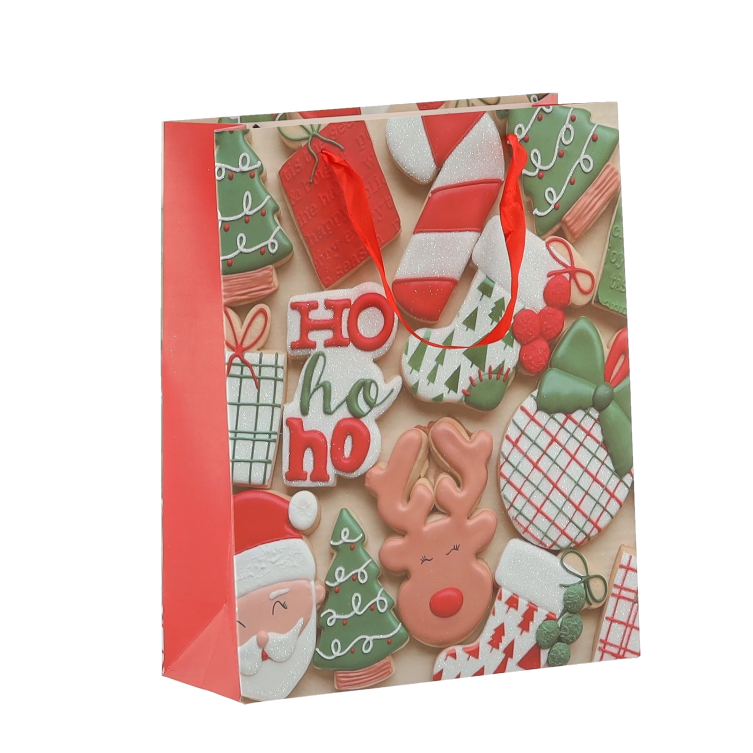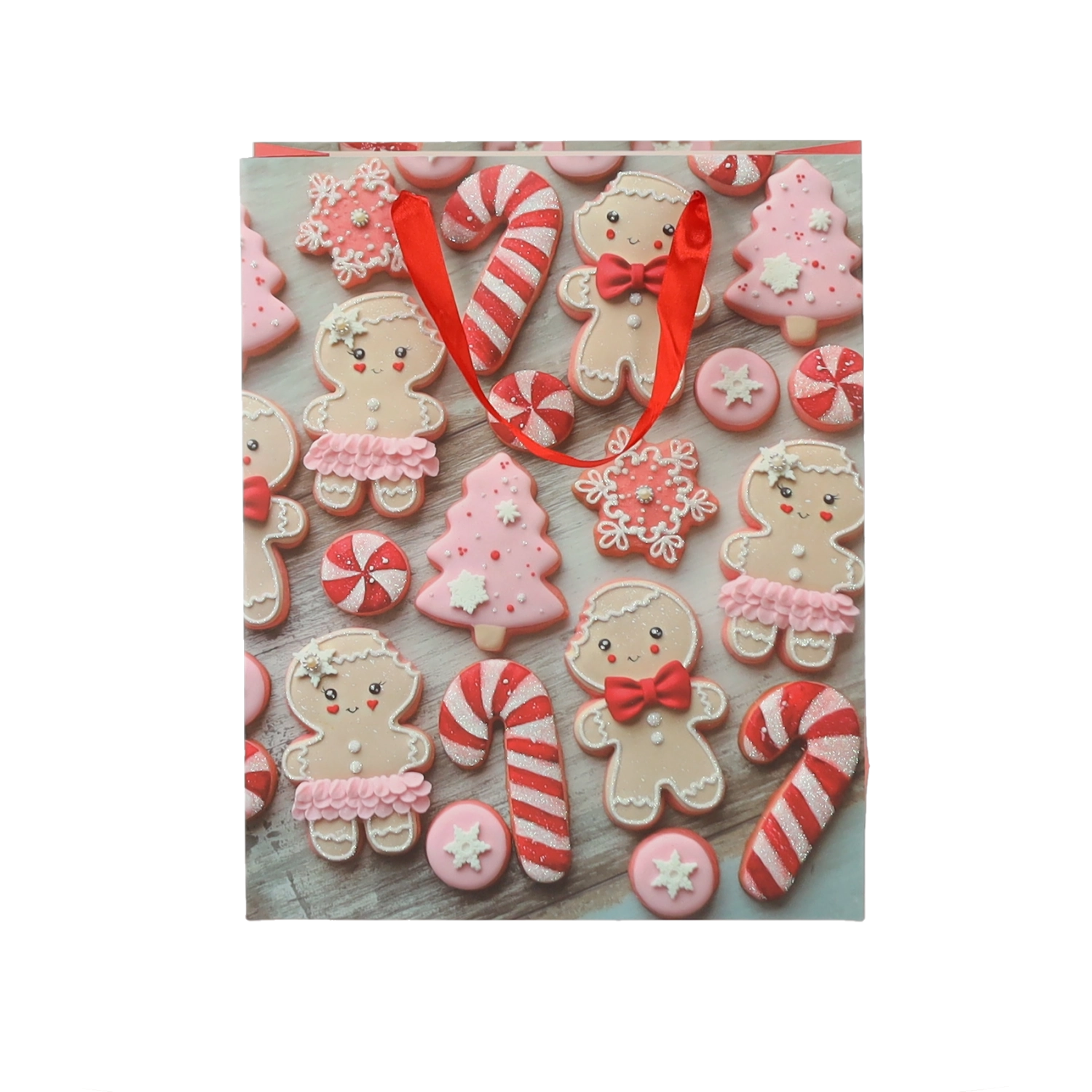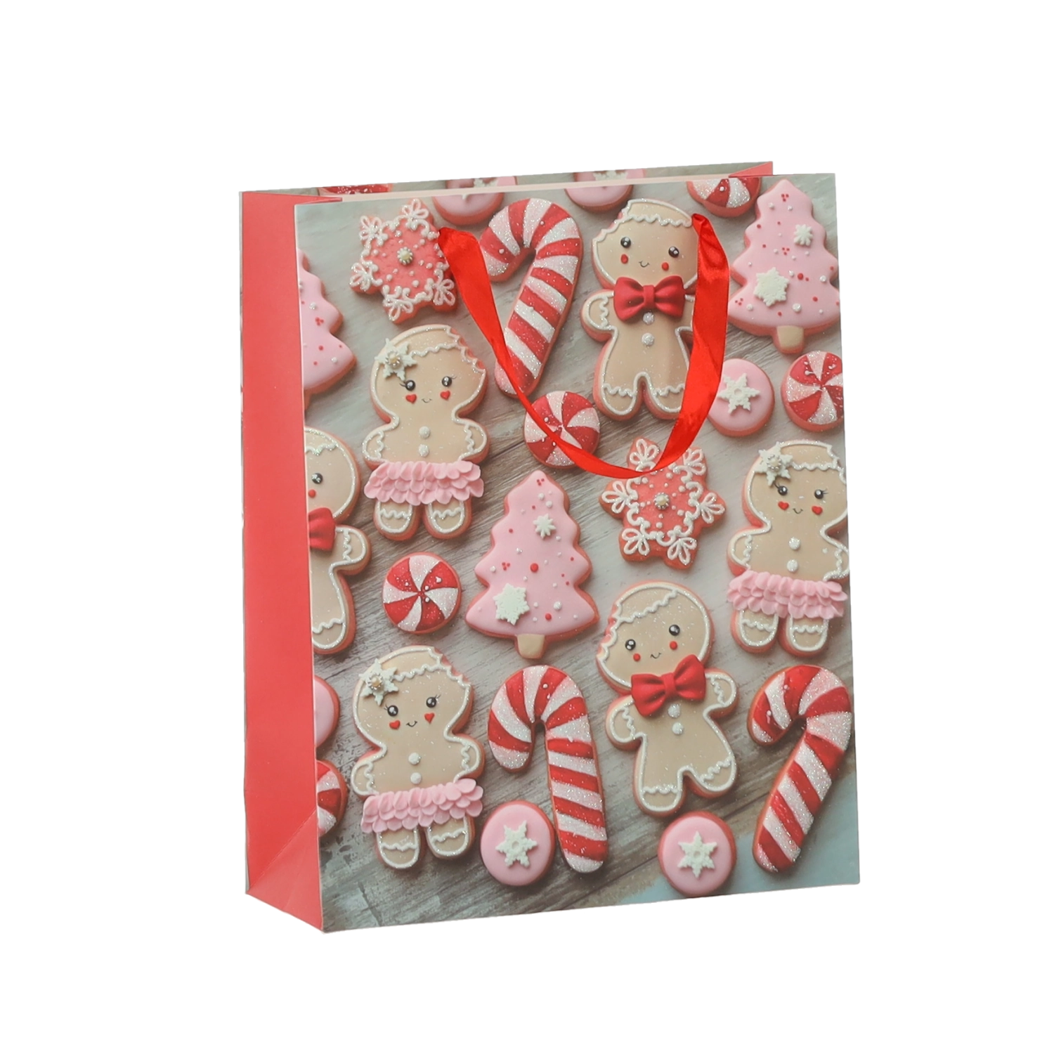 Set practic de 12 pungi cadou de Crăciun, dimensiune 18 × 24 × 8 cm, pentru ambalarea rapidă și stilată a cadourilor mici. Pungile din hârtie de calitate, cu gramaj 157 g/m², sunt rezistente și durabile, au mânere din panglică roșie pentru transport confortabil și un imprimeu vesel cu motive de biscuiți de Crăciun – Moș Crăciun, ren, brăduți și mănuși. Ideale pentru cosmetice, bijuterii și cărți mai mici.