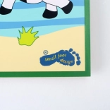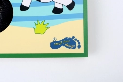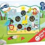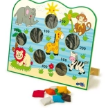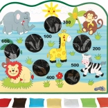 Tabla de joc cu ilustrații colorate de animale și punguțe colorate fac jocul atractiv și distractiv pentru copii.