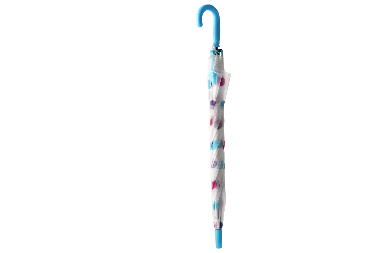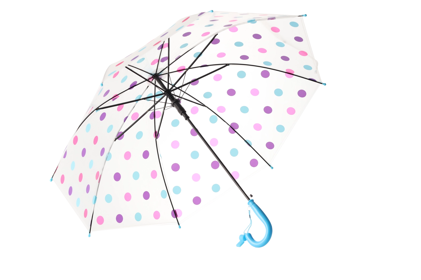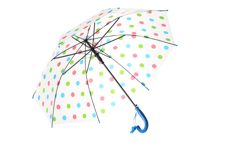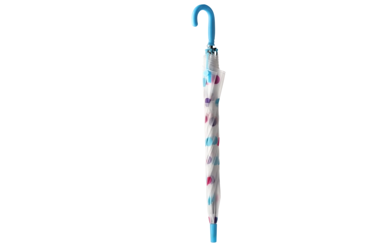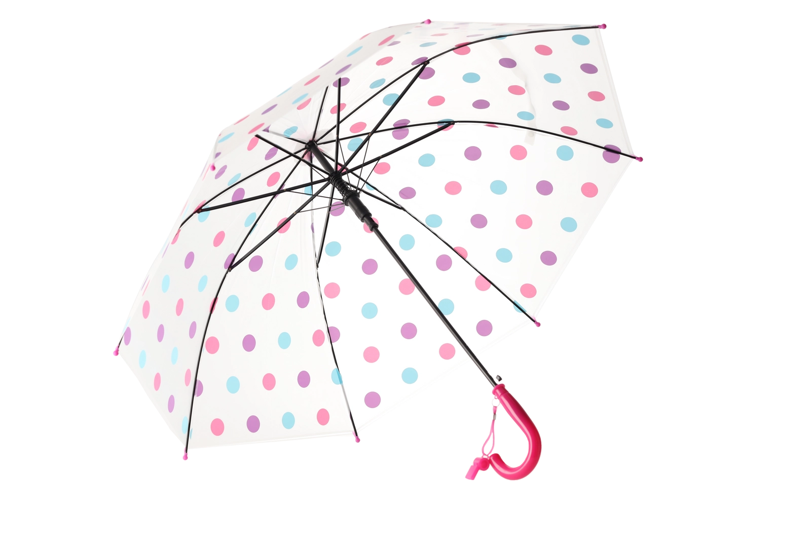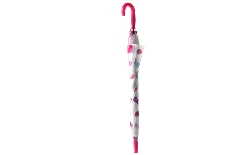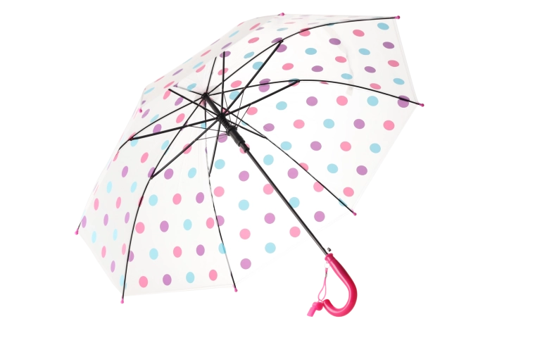 Baldachinul transparent, stilat, cu buline multicolore se potrivește cu diverse ținute și, în același timp, îmbunătățește vizibilitatea asupra împrejurimilor atunci când mergi pe ploaie.