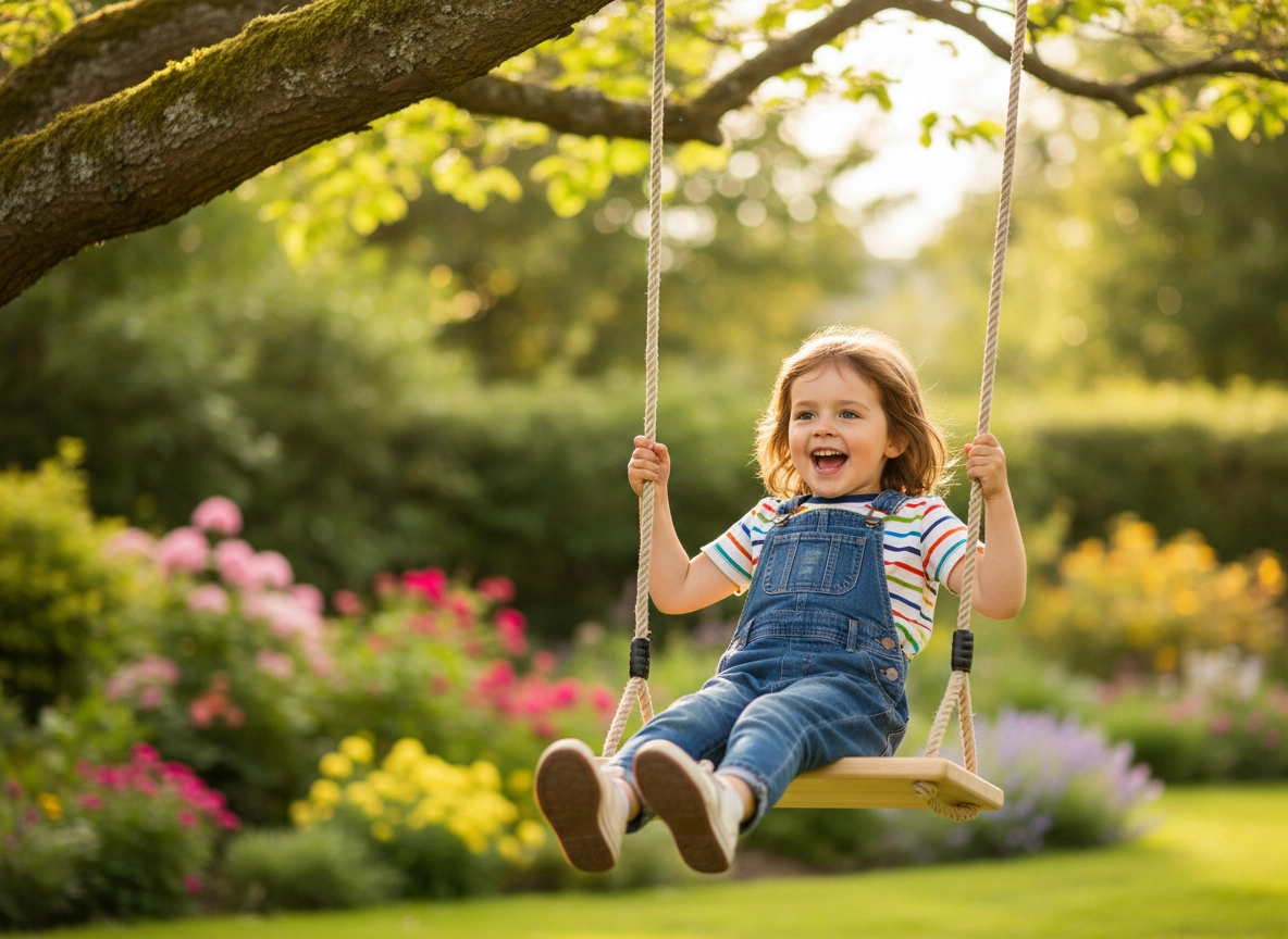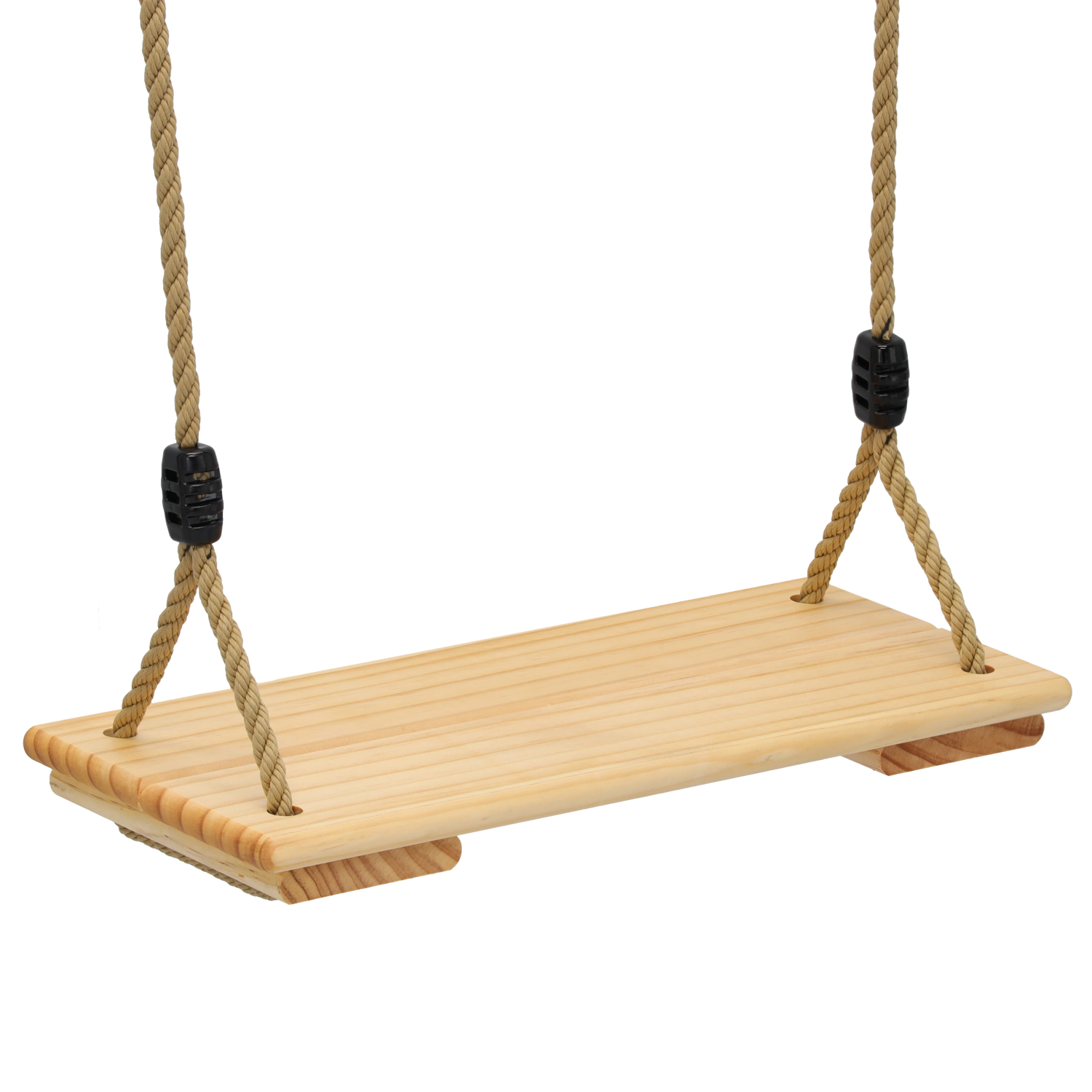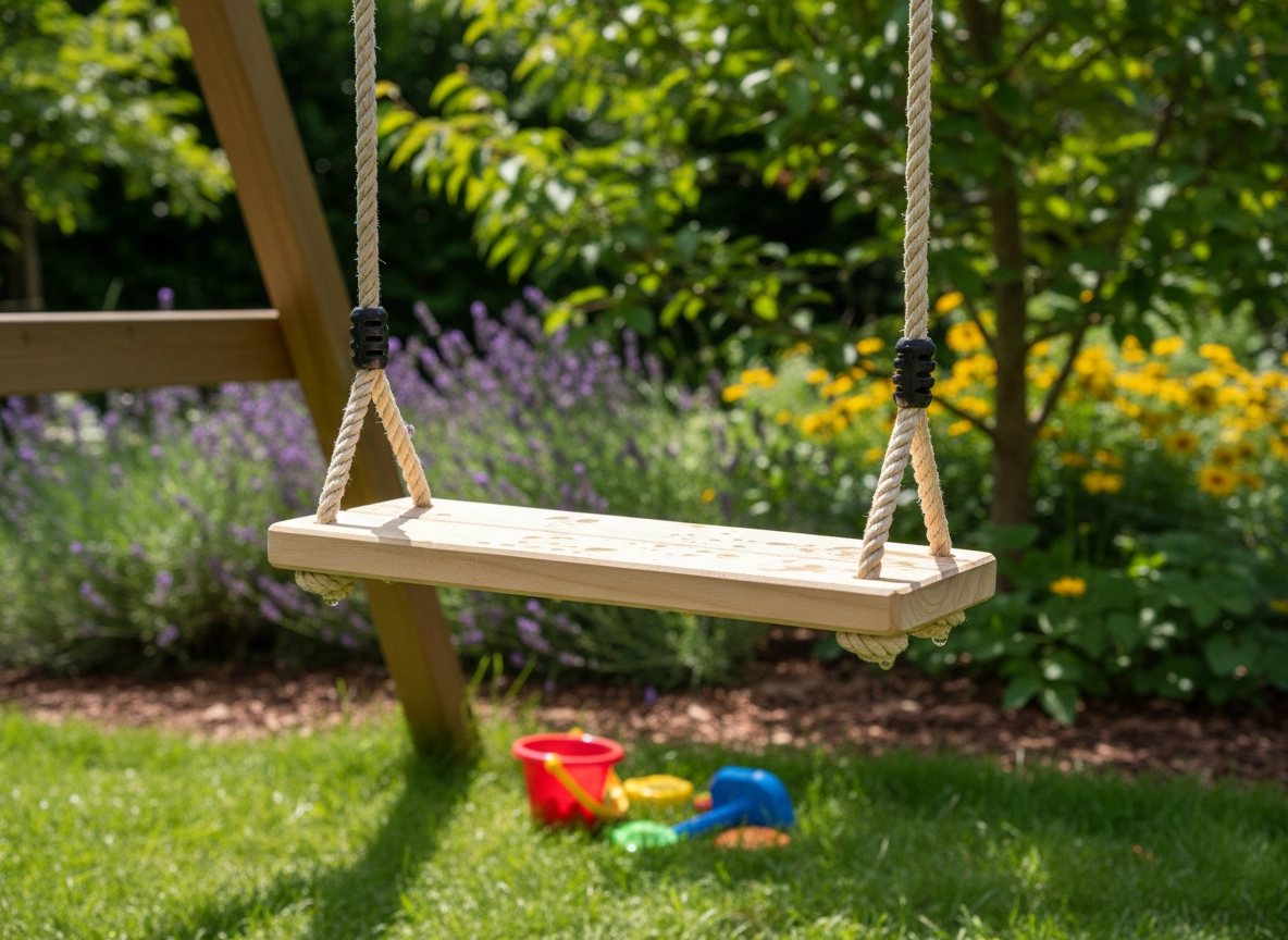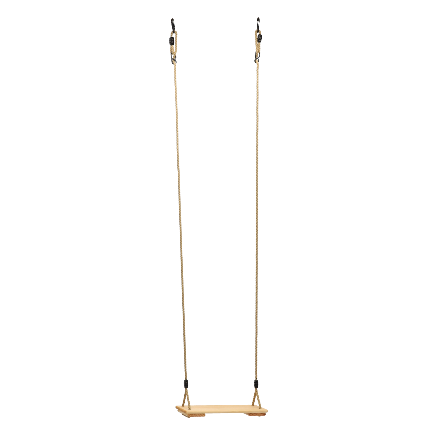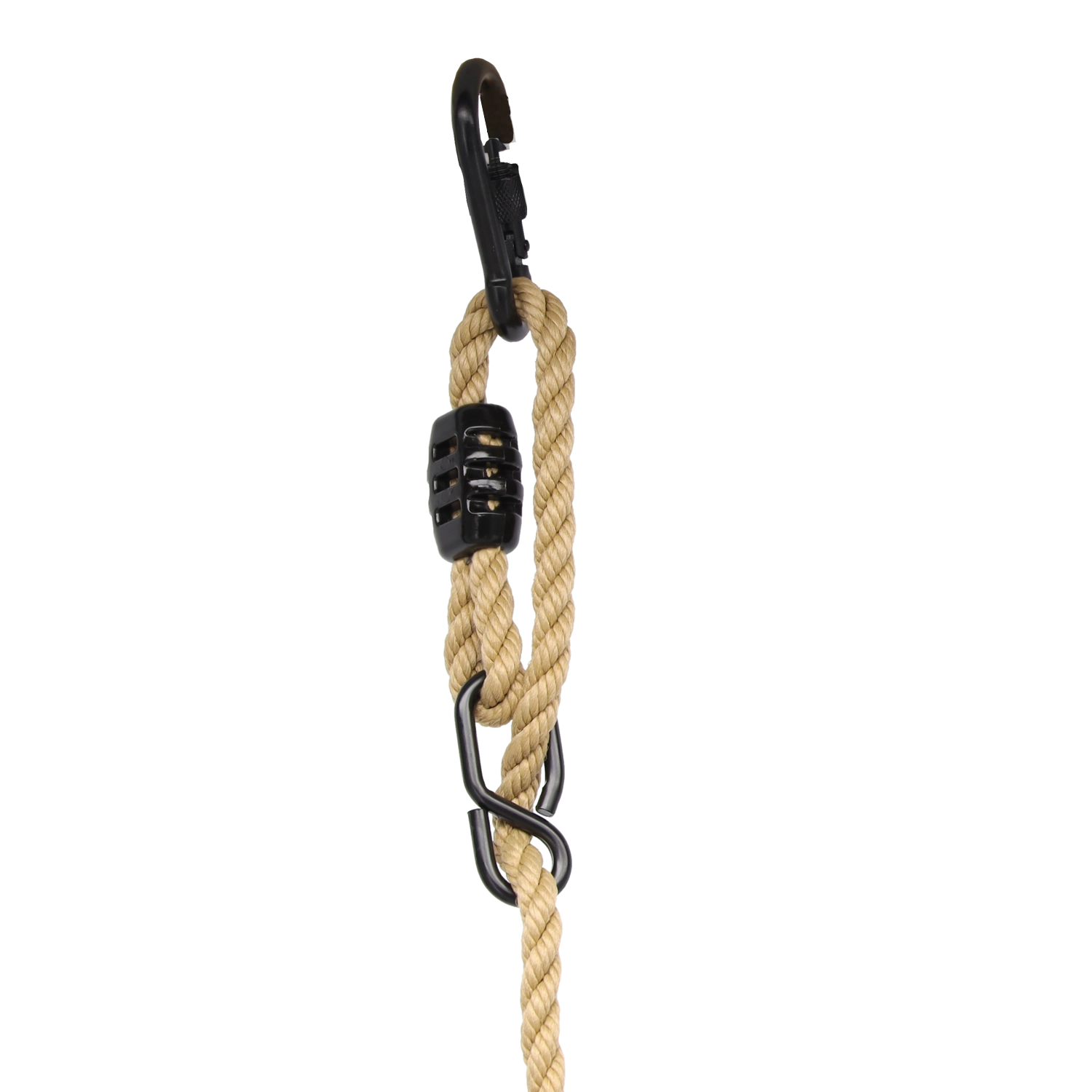 Frânghiile robuste, cu prinderi sigure și opritoare, permit ajustarea ușoară a înălțimii leagănului pentru copii și adulți.