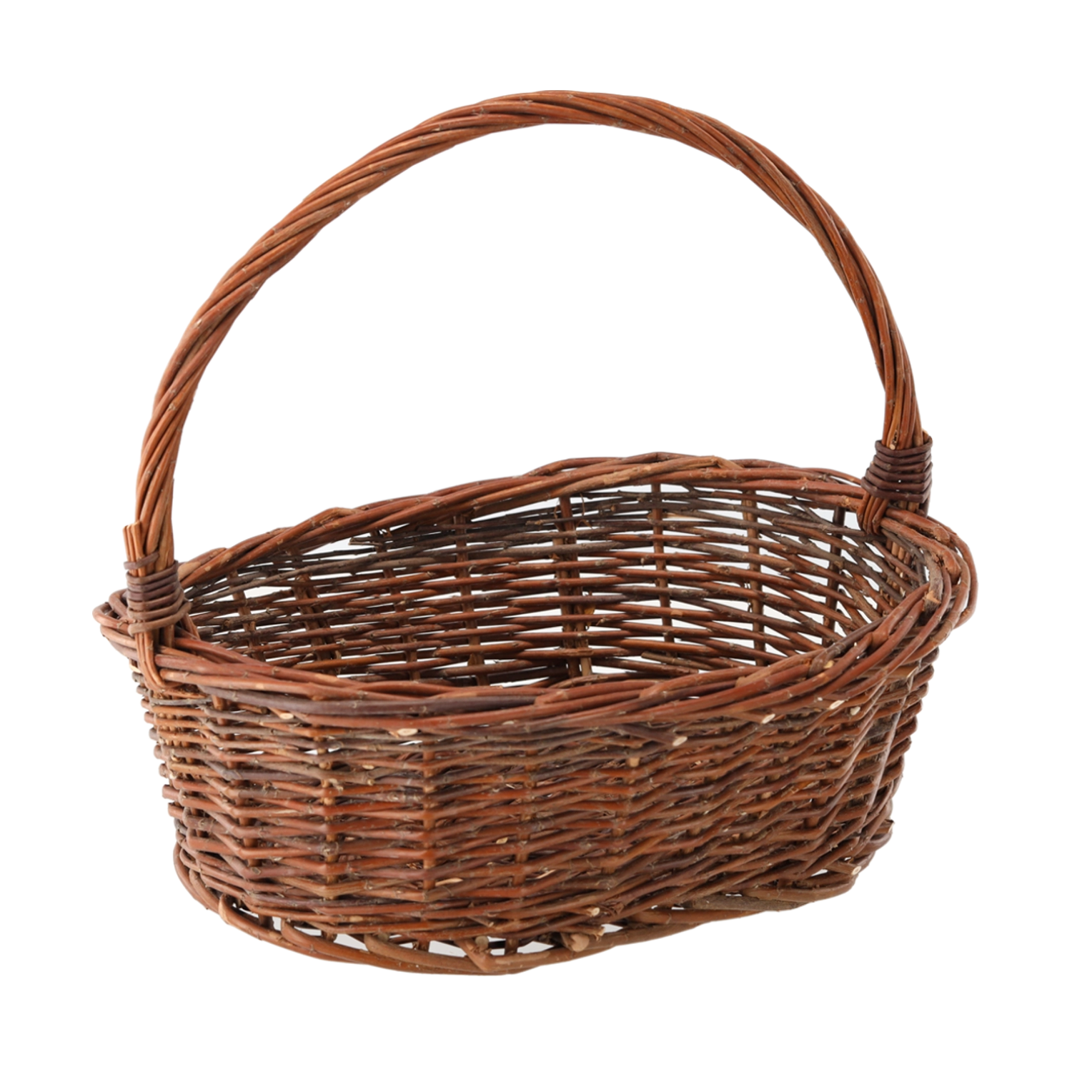 Coș din nuiele maro universal, cu dimensiunile 41 × 32 × 14/36 cm, ideal pentru cumpărături, picnicuri și cules de ciuperci. Oferă un interior încăpător, mâner robust și, datorită nuielelor naturale de calitate, este ușor, rezistent și ușor de transportat. Împletitura tradițională manuală evidențiază aspectul natural și durabilitatea îndelungată.