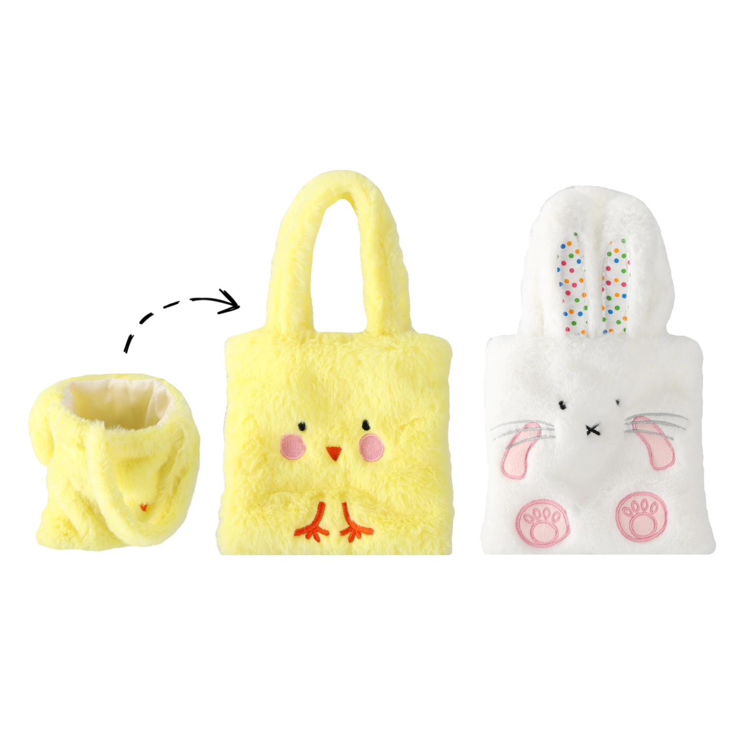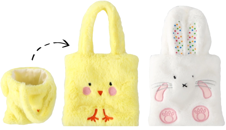 Această geantă de Paște stilată, în forma unui puișor sau iepuraș adorabil, este confecționată din material moale și catifelat, plăcut la atingere și deosebit de drăgălaș. Datorită dimensiunilor compacte de 16 × 16 cm, este ideală pentru strâns ouă, oferit micilor cadouri pentru copii sau ca accesoriu decorativ pentru masa de Paște.