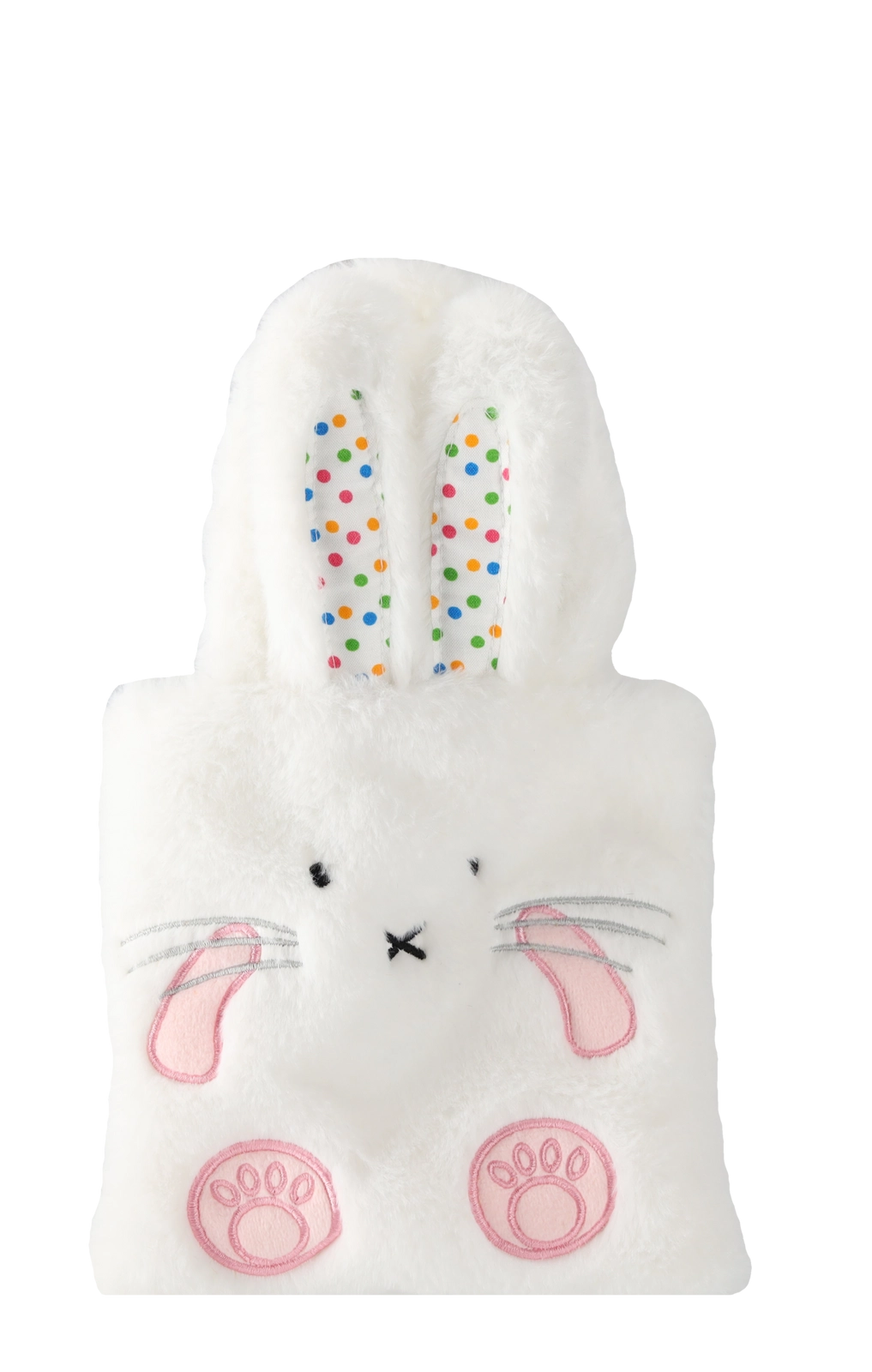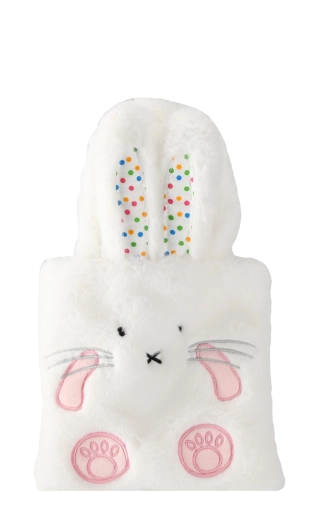 Varianta albă din pluș, cu urechi de iepuraș și broderii fine, este moale, sigură și te îmbie la mângâiere.