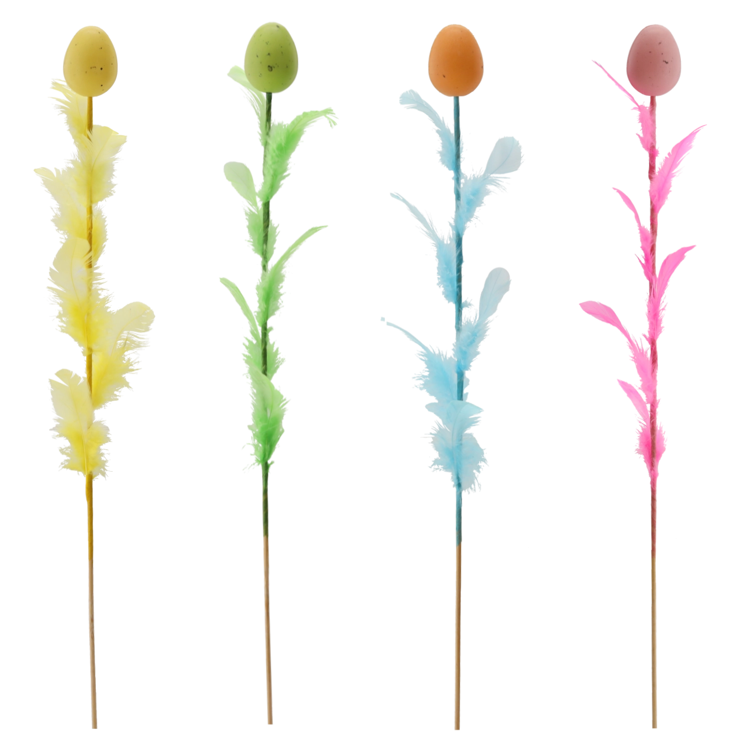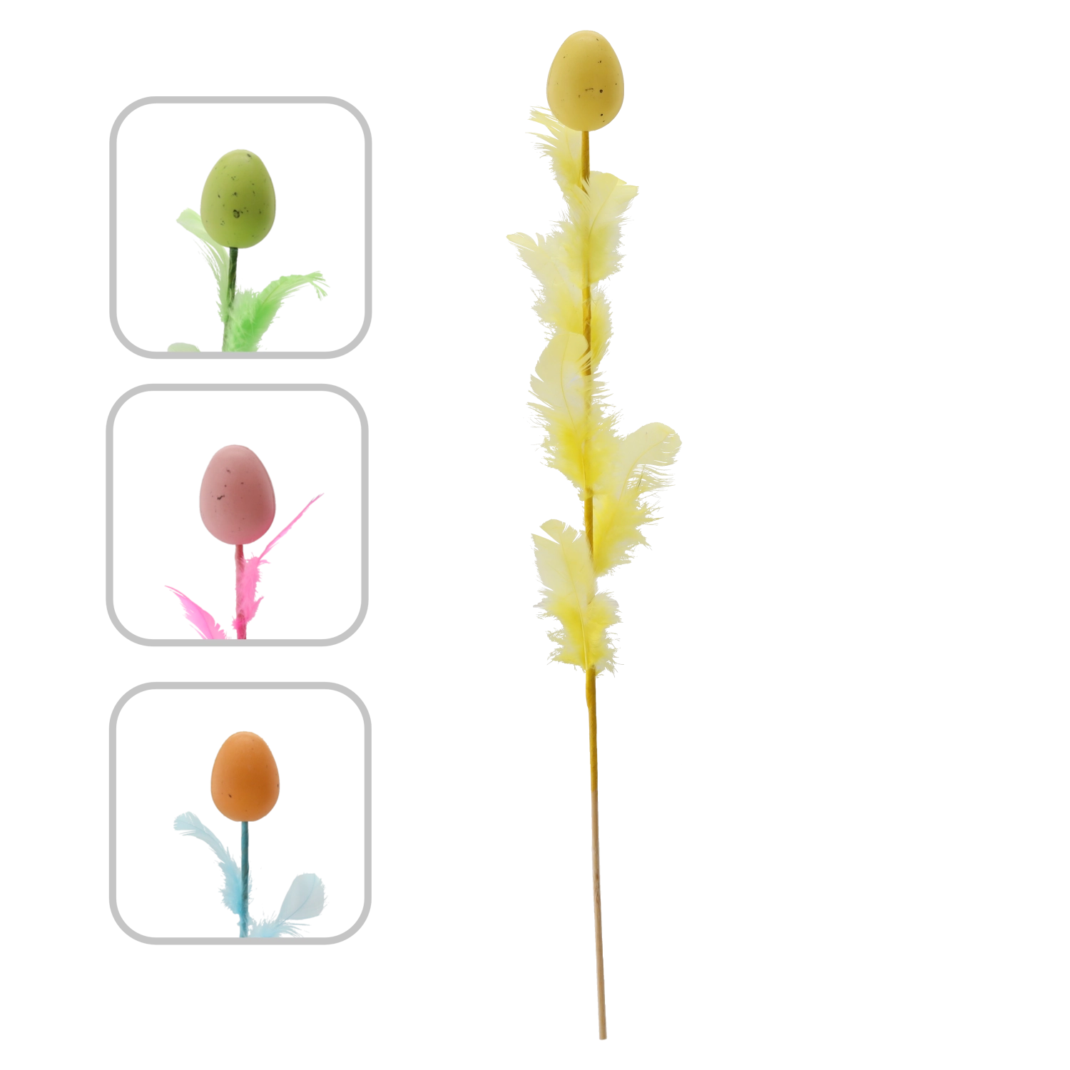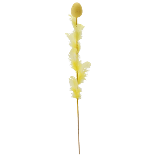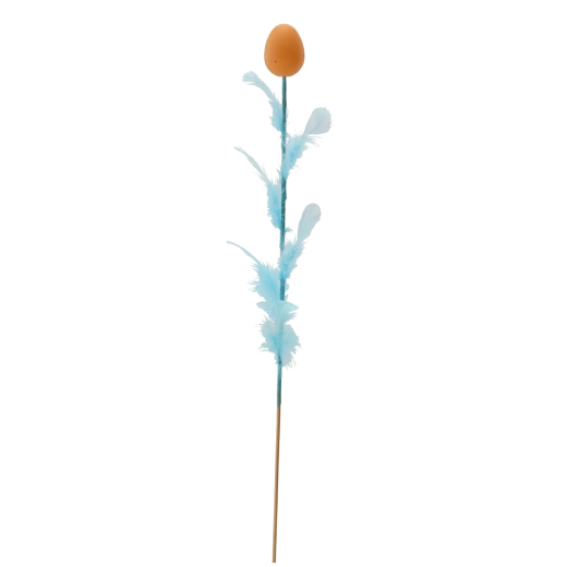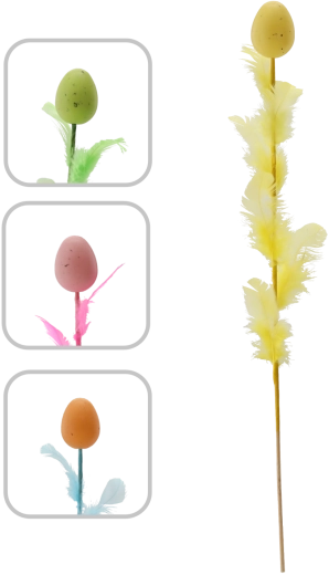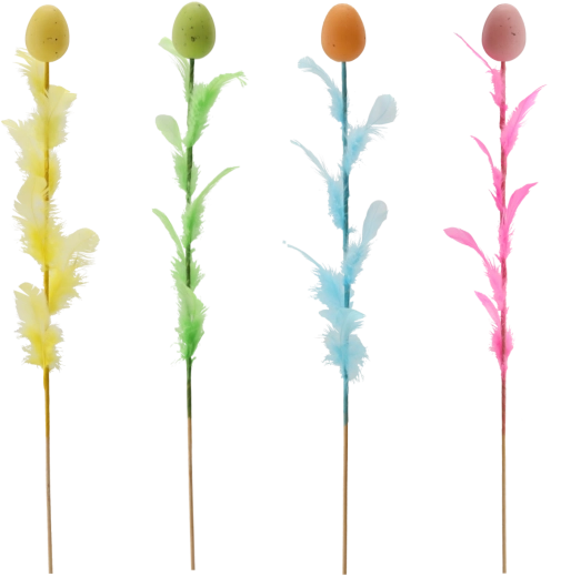 Decorațiune elegantă de Paște în formă de ou cu pene pe bețișor, lungime 45 cm, care va ilumina aranjamentele tale festive. Oferă un mix de patru culori proaspete, ce adaugă varietate și atmosferă de primăvară interiorului. Penele fine pentru lejeritate și aerisire o fac o alegere ideală pentru buchete, coșulețe și vaze.