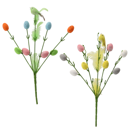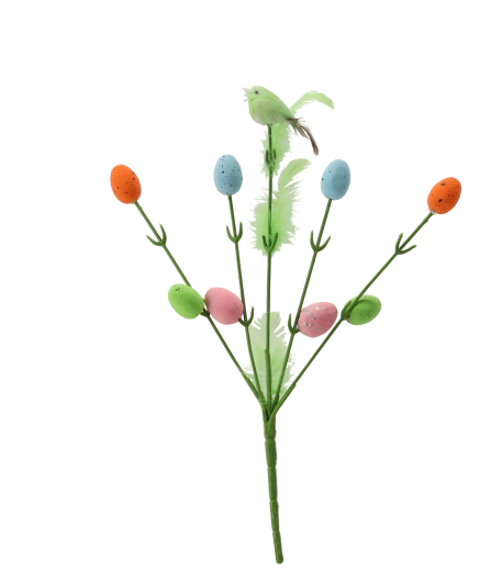 Această decorațiune de Paște pe bețișor combină o ramură delicată, un păsărel drăguț și oușoare mici – simboluri ale primăverii și ale vieții noi. Este ideală pentru buchete florale, coroane, decorațiuni de masă sau ca accent solitar într-o vază. Datorită designului universal, se potrivește ușor atât în interioare tradiționale, cât și moderne.